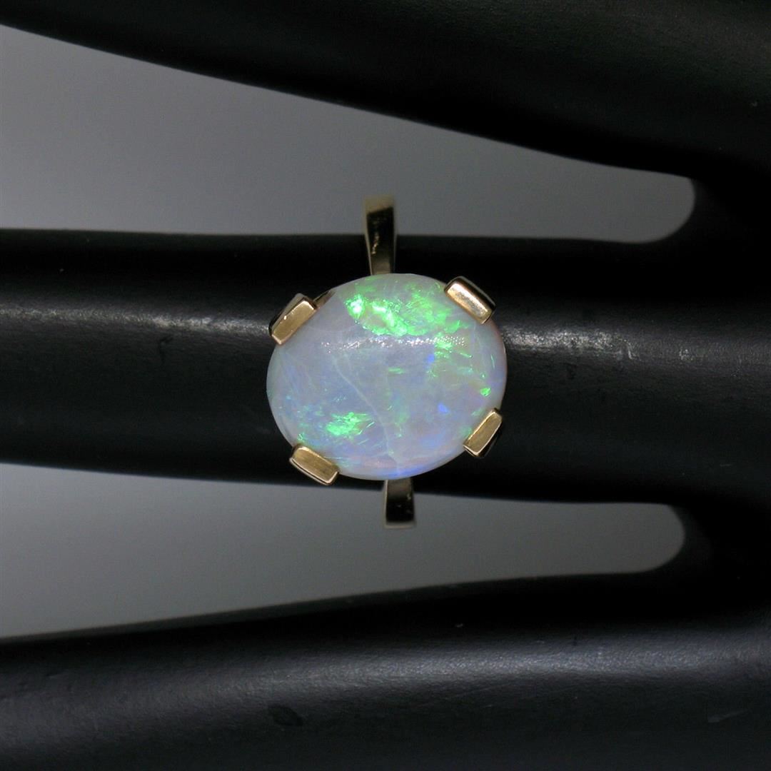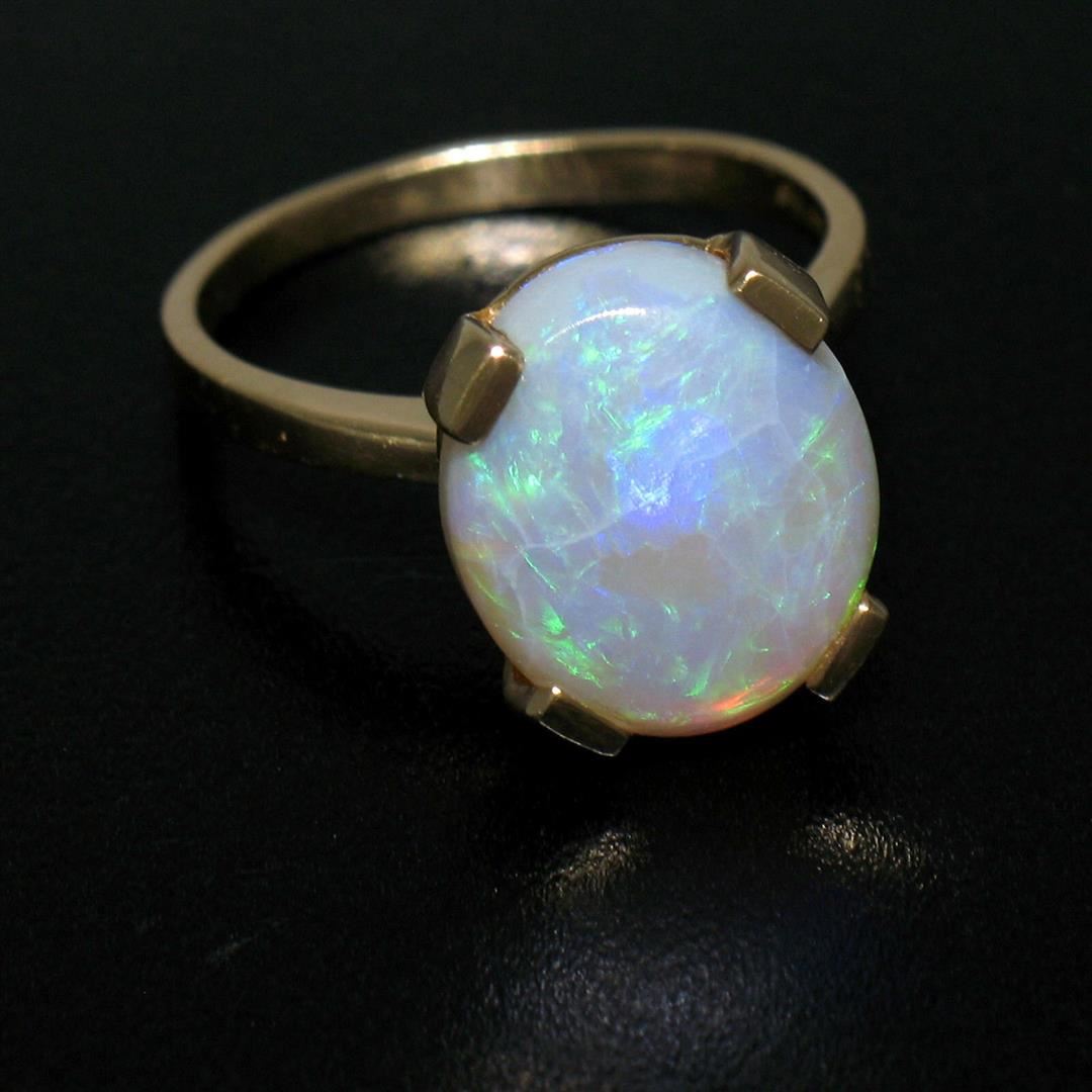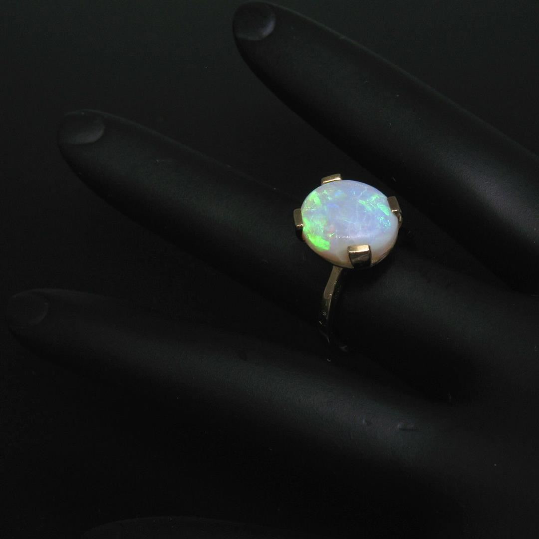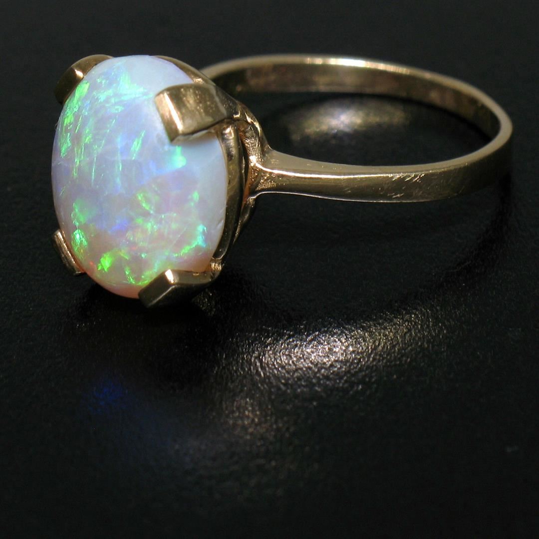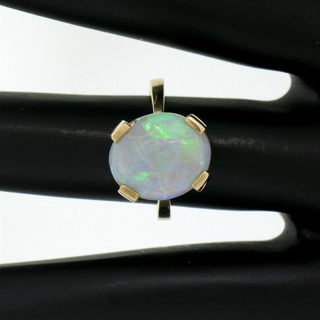 One Vintage 14K Solid Yellow Gold 3.00ct Oval Cabochon Opal Solitaire Ring Size 4.5. Item Details: Material: 14K Solid Yellow Gold, Weight: 3.15 Grams, Stone(s): (1) Natural Genuine Opal - Oval Cabochon Cut - Prong Set - White w/ Beautiful Blue and Green Play - 11.95x10.10mm, Total Carat Weight: 3.00 (approx.), Ring Size: 4.5, Ring Width: 12.00mm, Ring Height: 9.98mm rise off the finger, Condition: Vintage opal ring. The stone shows some crazing. Great overall and ready to wear condition!