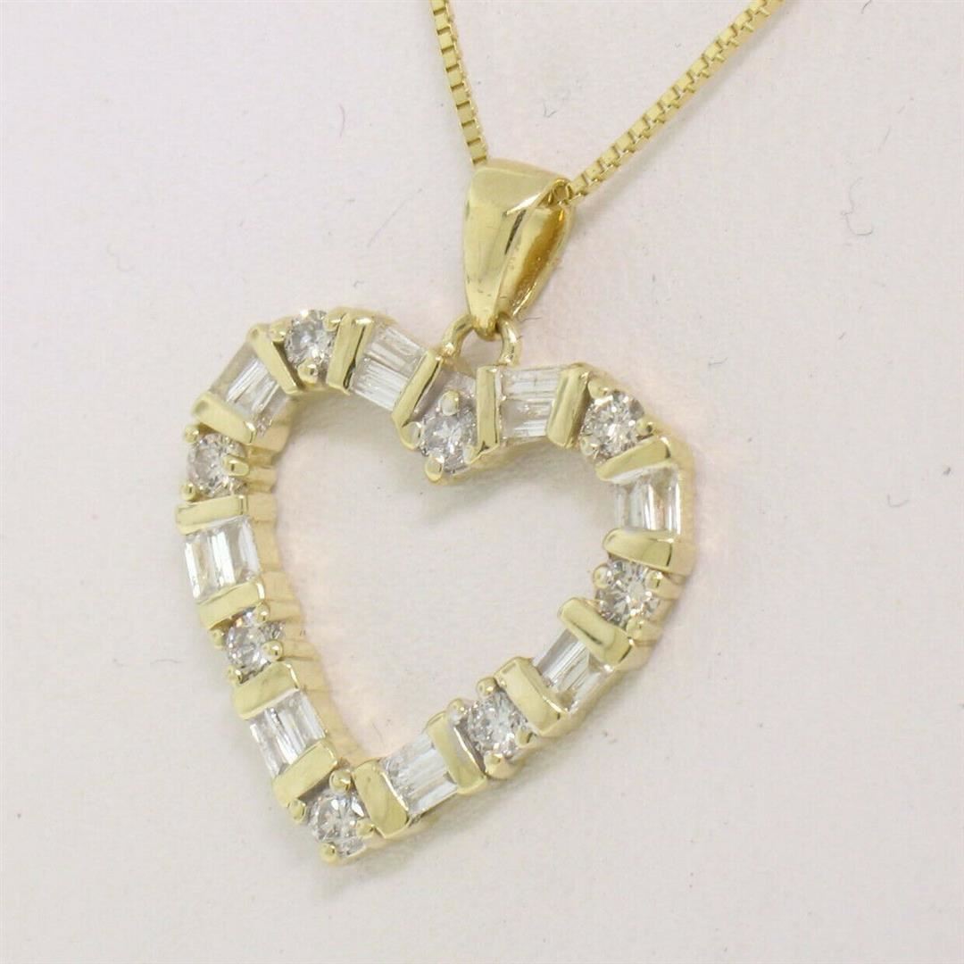 One 14K Yellow Gold 0.70ctw Round & Baguette Cut Diamond Open Heart Pendant Necklace. Item Details: Material: 14K Solid Yellow Gold, Weight: 3.20 Grams , Stone: (8) Natural Genuine Diamonds - Round Brilliant Cut - G Color - SI1 Clarity - 0.20ctw (approx.), (16) Natural Genuine Diamonds - Baguette Cut - G Color - SI1 Clarity - 0.50ctw (approx.), Dimensions: 16.94x16.41mm, Chain: 17.5" - 14K Solid Yellow Gold 1.0mm Box Link Chain, Condition: Like New,