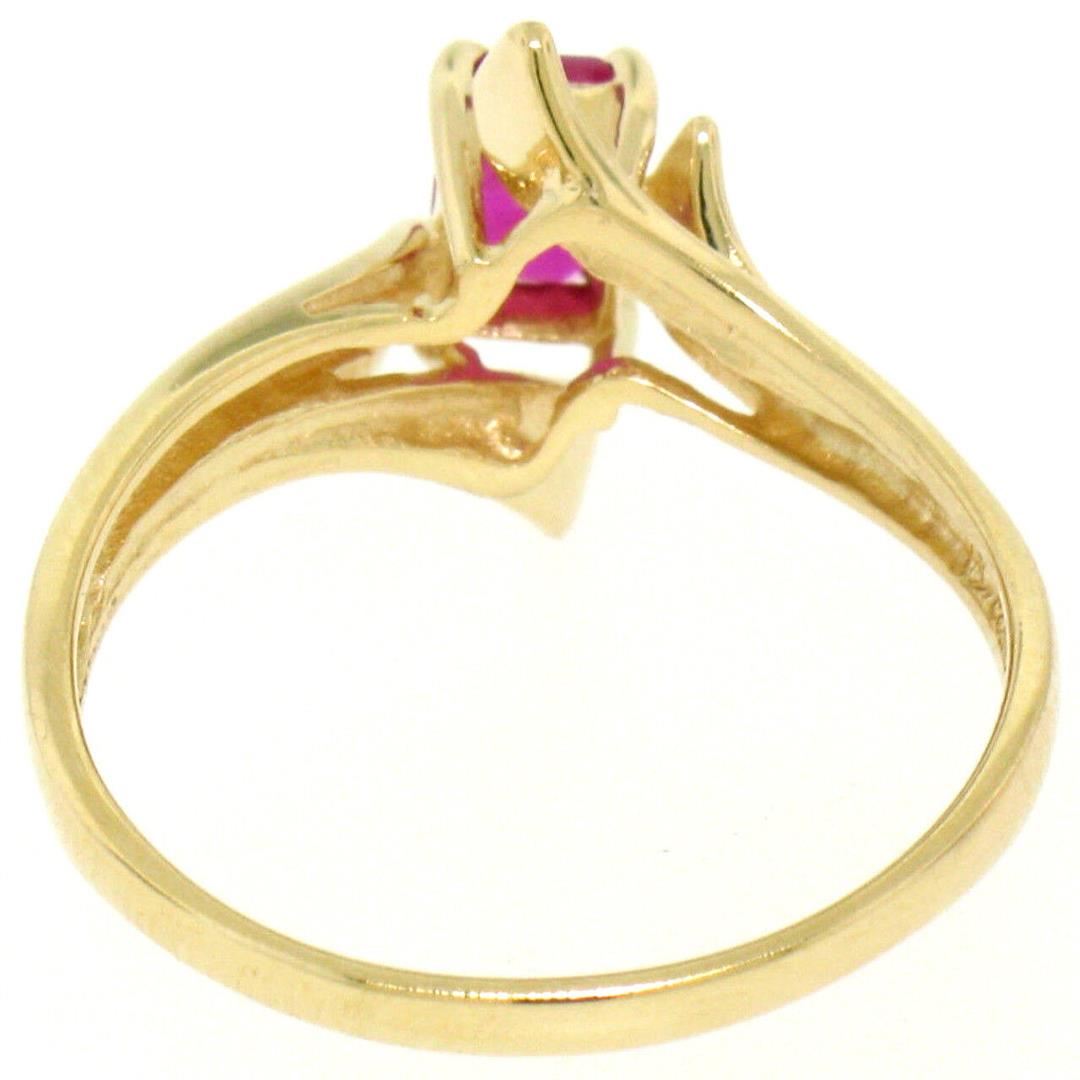 An estate solid 14k yellow gold solitaire bypass ring, featuring 1 emerald cut natural ruby (4.09x6.07mm ; 0.83ct). The ring is size 8.0, weighs a total of 2.6 grams, and measures 8.12mm wide.