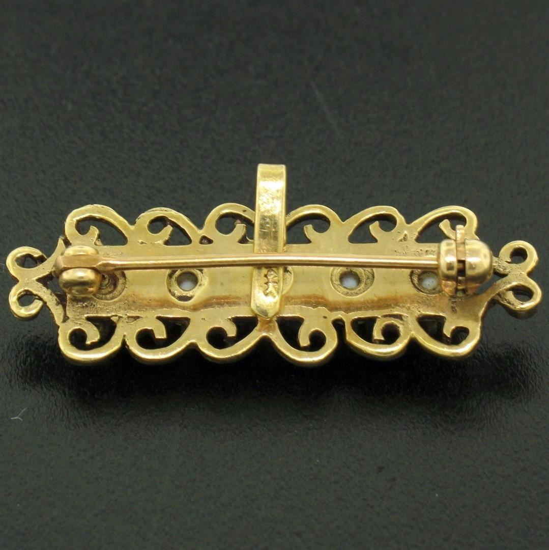 One Vintage 14K Solid Yellow Gold Bar Open Work with Pearls Pin Brooch & Pendant. Item Details: Material: 14K Solid Yellow Gold, Total Weight: 4.0 Grams, Stone(s): (5) Natural Genuine Pearls - Prong Set - 3.4mm (Approx.), Overall Height: 31.02mm, Overall Width: 10.29mm, Condition: Vintage pin w/ original patina preserved. Can be Polished to like new if desired.