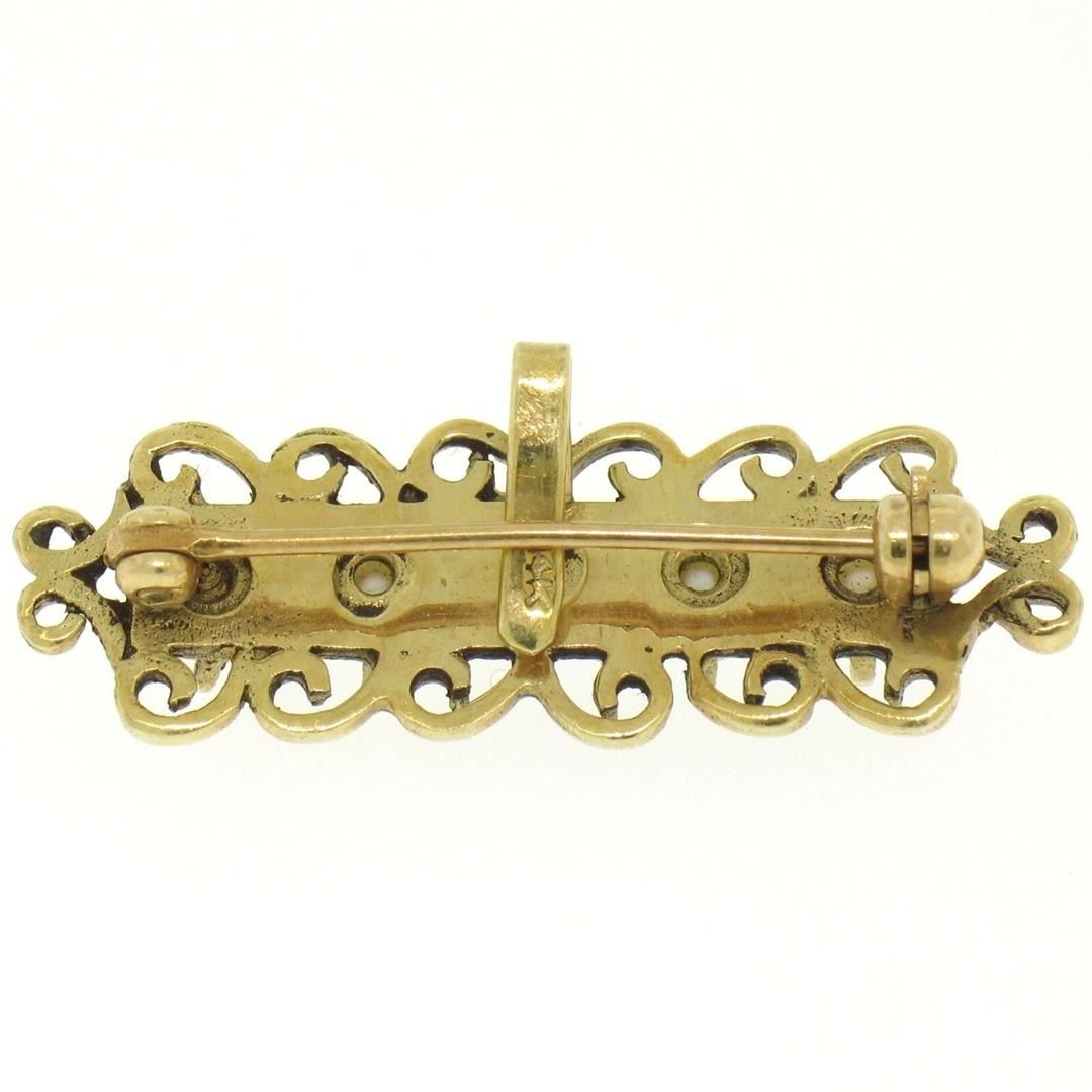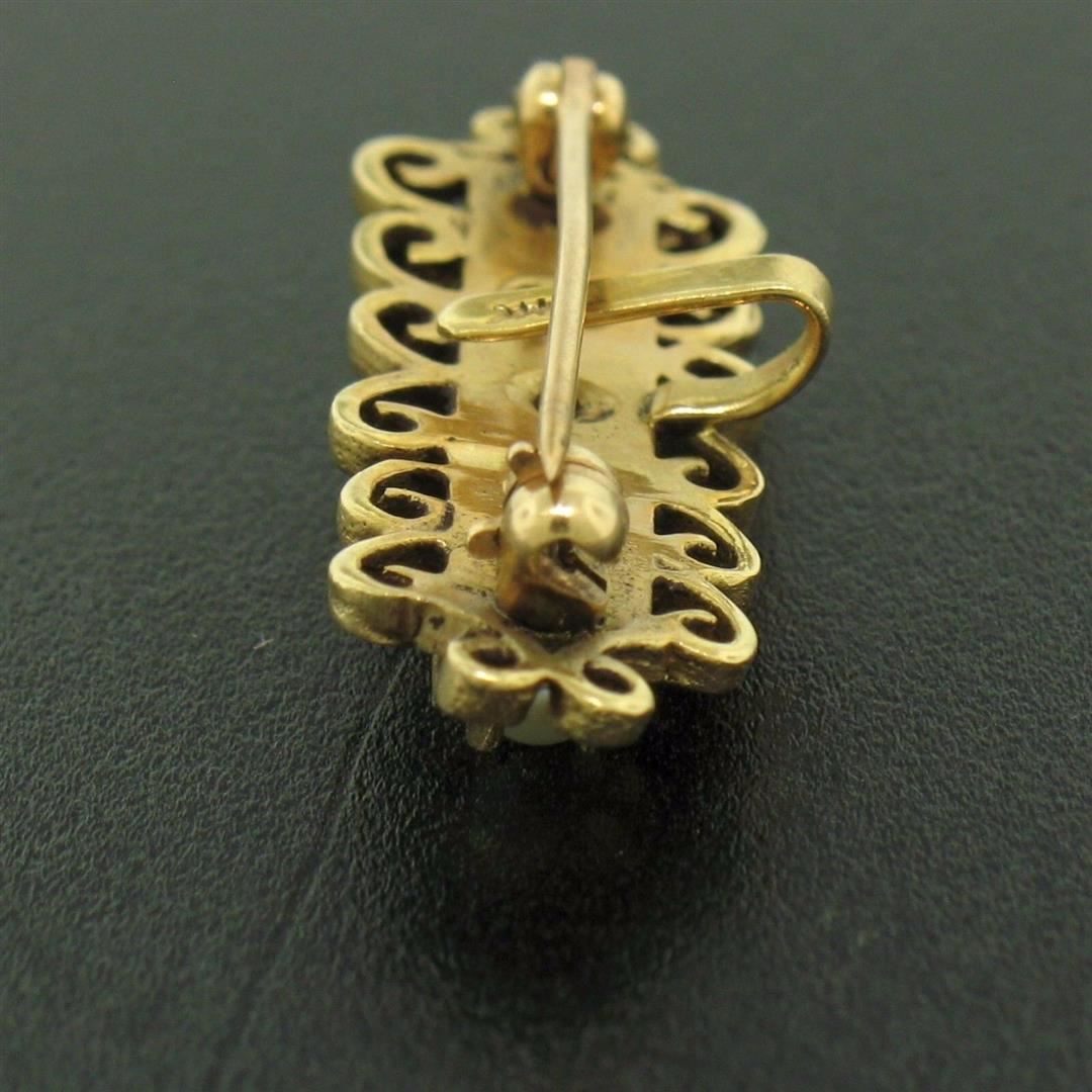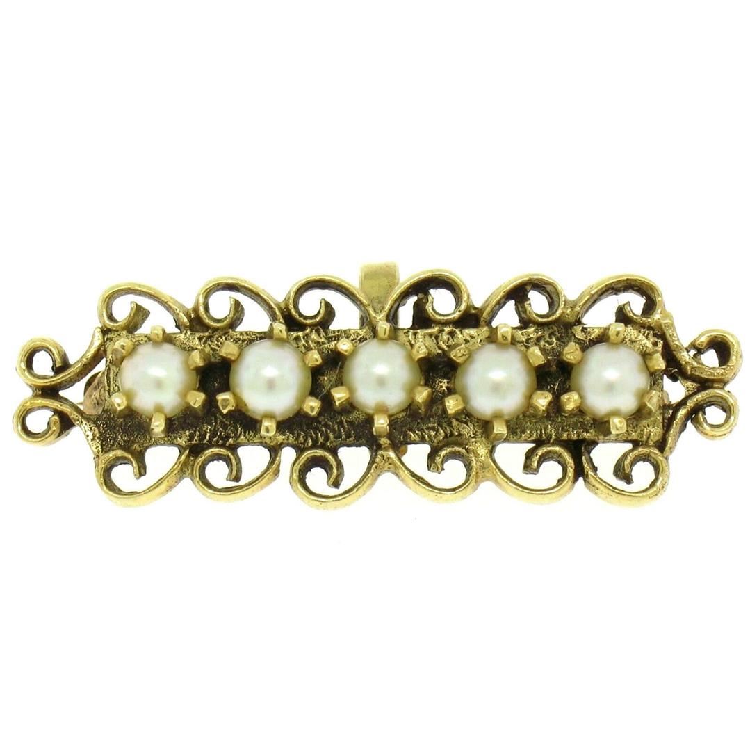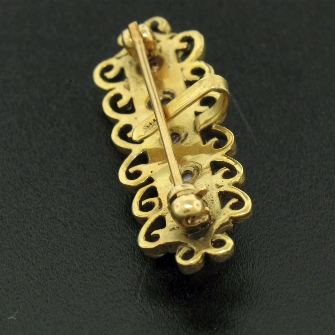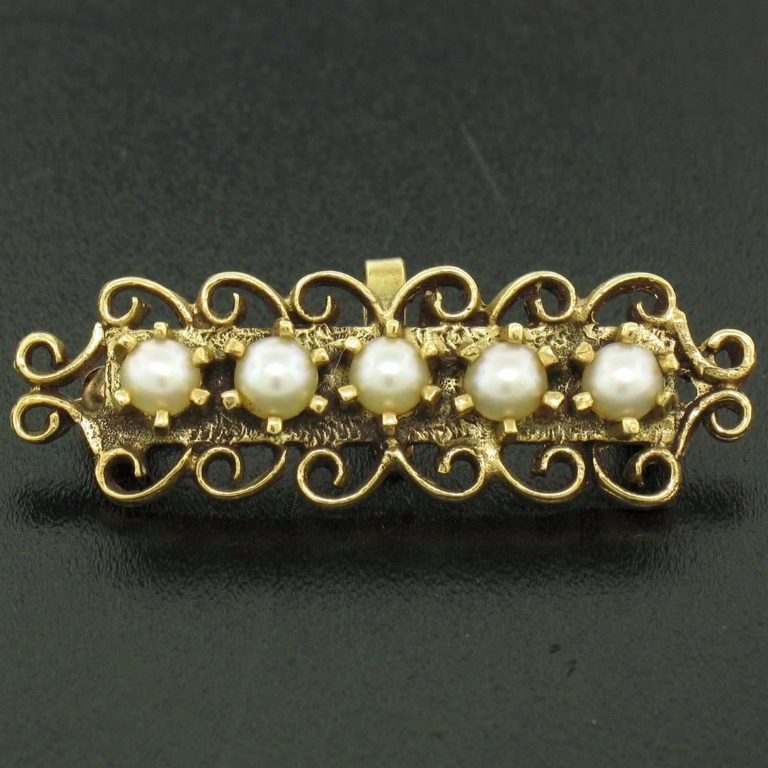 One Vintage 14K Solid Yellow Gold Bar Open Work with Pearls Pin Brooch & Pendant. Item Details: Material: 14K Solid Yellow Gold, Total Weight: 4.0 Grams, Stone(s): (5) Natural Genuine Pearls - Prong Set - 3.4mm (Approx.), Overall Height: 31.02mm, Overall Width: 10.29mm, Condition: Vintage pin w/ original patina preserved. Can be Polished to like new if desired.