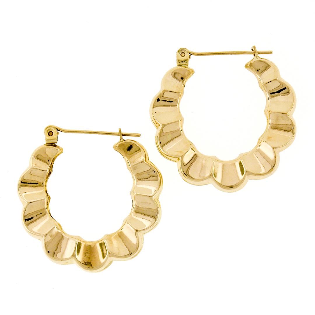 14K Solid Yellow Gold Puffed Polished Scalloped Flower Snap Hoop Earrings. A brand new pair of solid 14k yellow gold hoop earrings with a puffed and scalloped floral design. The earrings measure approximately 24.40x24.25mm and weigh a total of 1.8 grams.