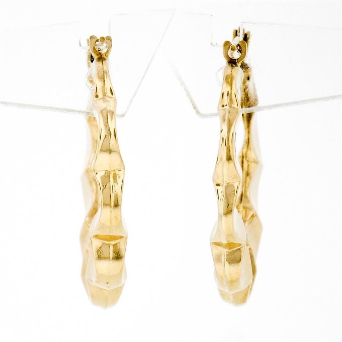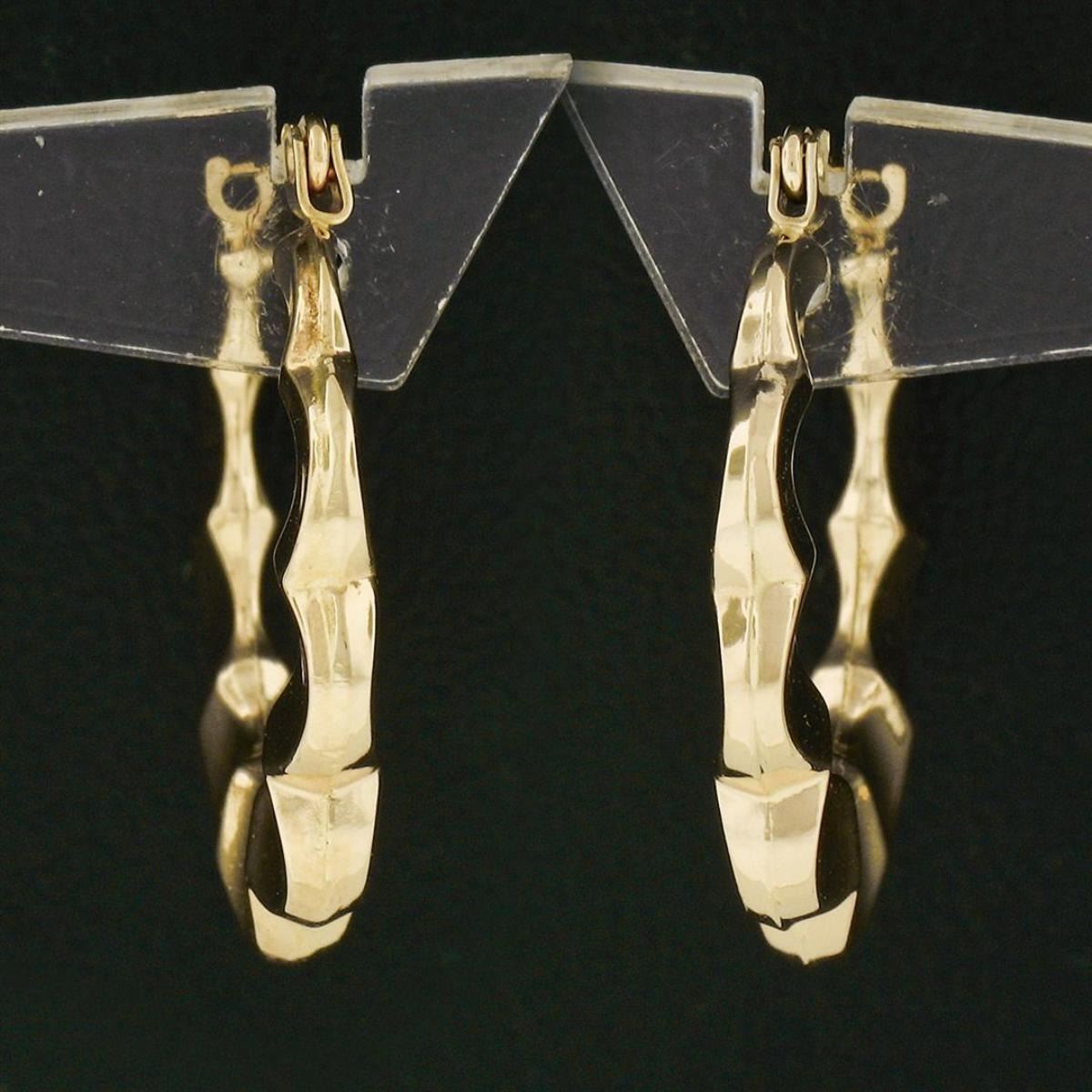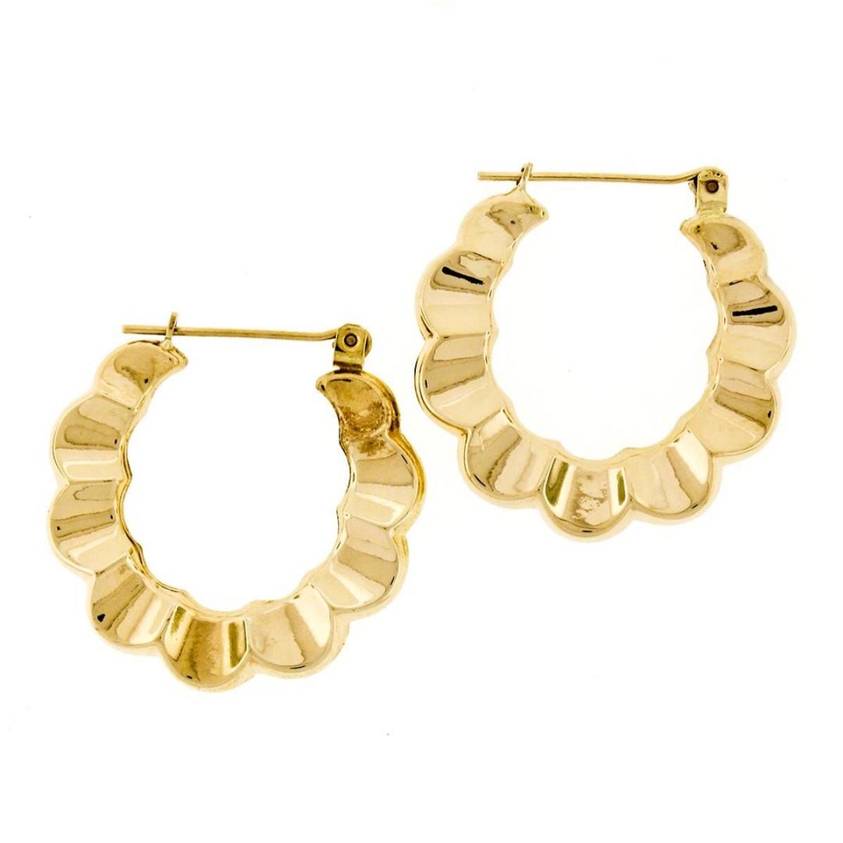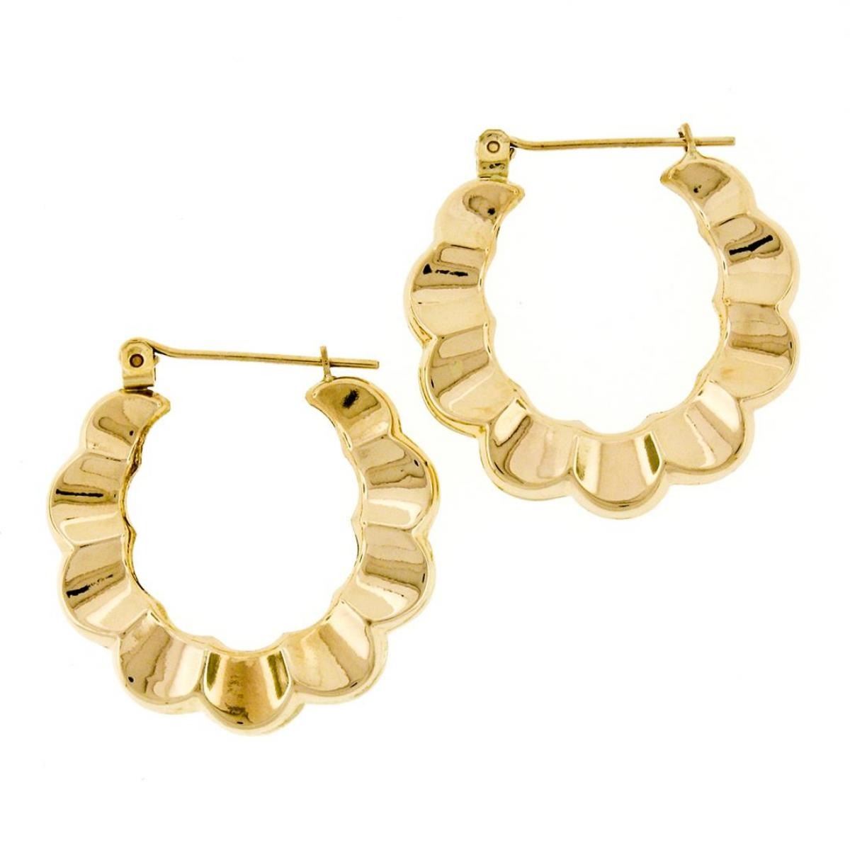 14K Solid Yellow Gold Puffed Polished Scalloped Flower Snap Hoop Earrings. A brand new pair of solid 14k yellow gold hoop earrings with a puffed and scalloped floral design. The earrings measure approximately 24.40x24.25mm and weigh a total of 1.8 grams.