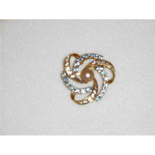 14K Yellow gold swirl pin with white and blue stones surrounding a central pearl, Marked on reverse 575.