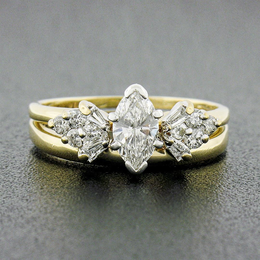 A solid 14k yellow & white gold engagement wedding ring set. with 1 marquise cut natural diamond (G - SI2 ; 4.1x7.25mm - 0.40ct), and 8 round brilliant cut natural diamonds ( G/H - SI1/SI2 ; 0.20ctw), with 4 baguette cut natural diamonds ( G/H - VS2/SI1 ; 0.10ctw). The ring is size 6.0, weighs a total of 4.18 grams, and measures 8.10mm wide.