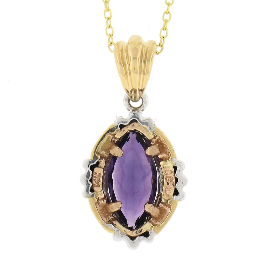 A solid 14k yellow & white gold pendant necklace, with 1 marquise cut natural amethyst (9.3x5.0mm). Adjustable to 16 & 18 inch cable link chain, 3.58 grams total weight, pendant measures 21.1x10.8mm.