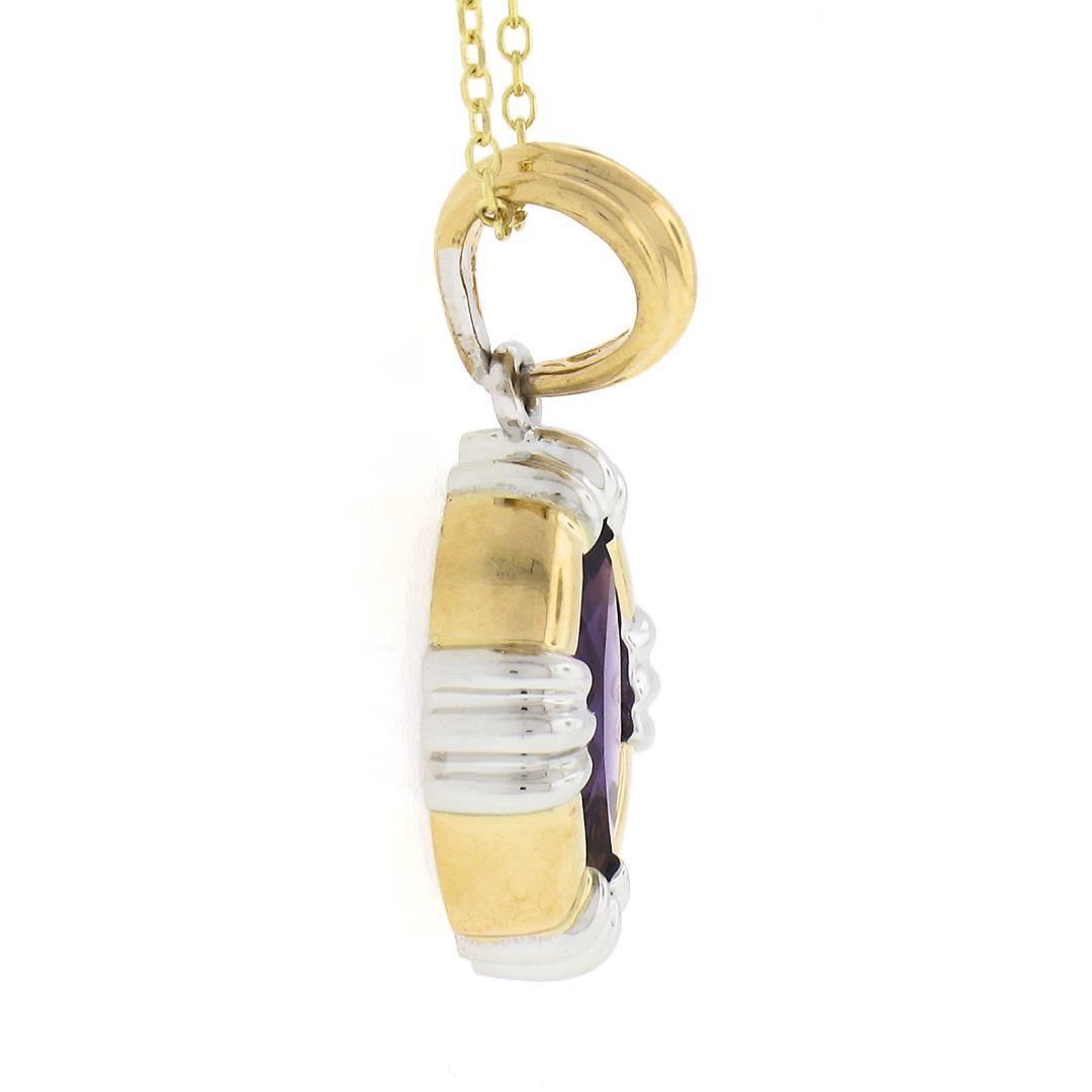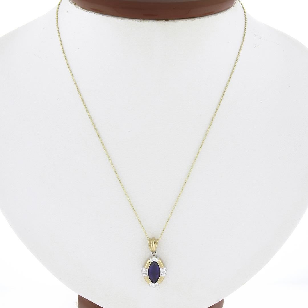 A solid 14k yellow & white gold pendant necklace, with 1 marquise cut natural amethyst (9.3x5.0mm). Adjustable to 16 & 18 inch cable link chain, 3.58 grams total weight, pendant measures 21.1x10.8mm.