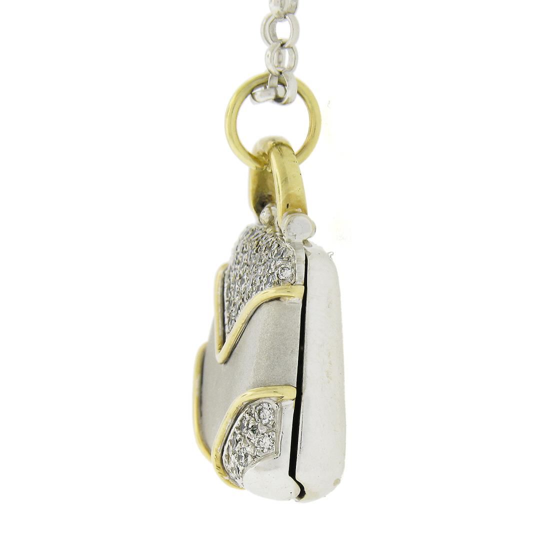 A solid 14k white & yellow gold purse pendant necklace, with numerous of round cut natural diamonds (G-I - SI1-I1 ; 1-1.25ctw). 25 inch rolo link chain, 26.24 grams total weight, pendant measures 32.8x28.2mm.