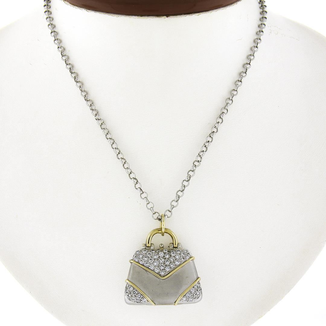 A solid 14k white & yellow gold purse pendant necklace, with numerous of round cut natural diamonds (G-I - SI1-I1 ; 1-1.25ctw). 25 inch rolo link chain, 26.24 grams total weight, pendant measures 32.8x28.2mm.