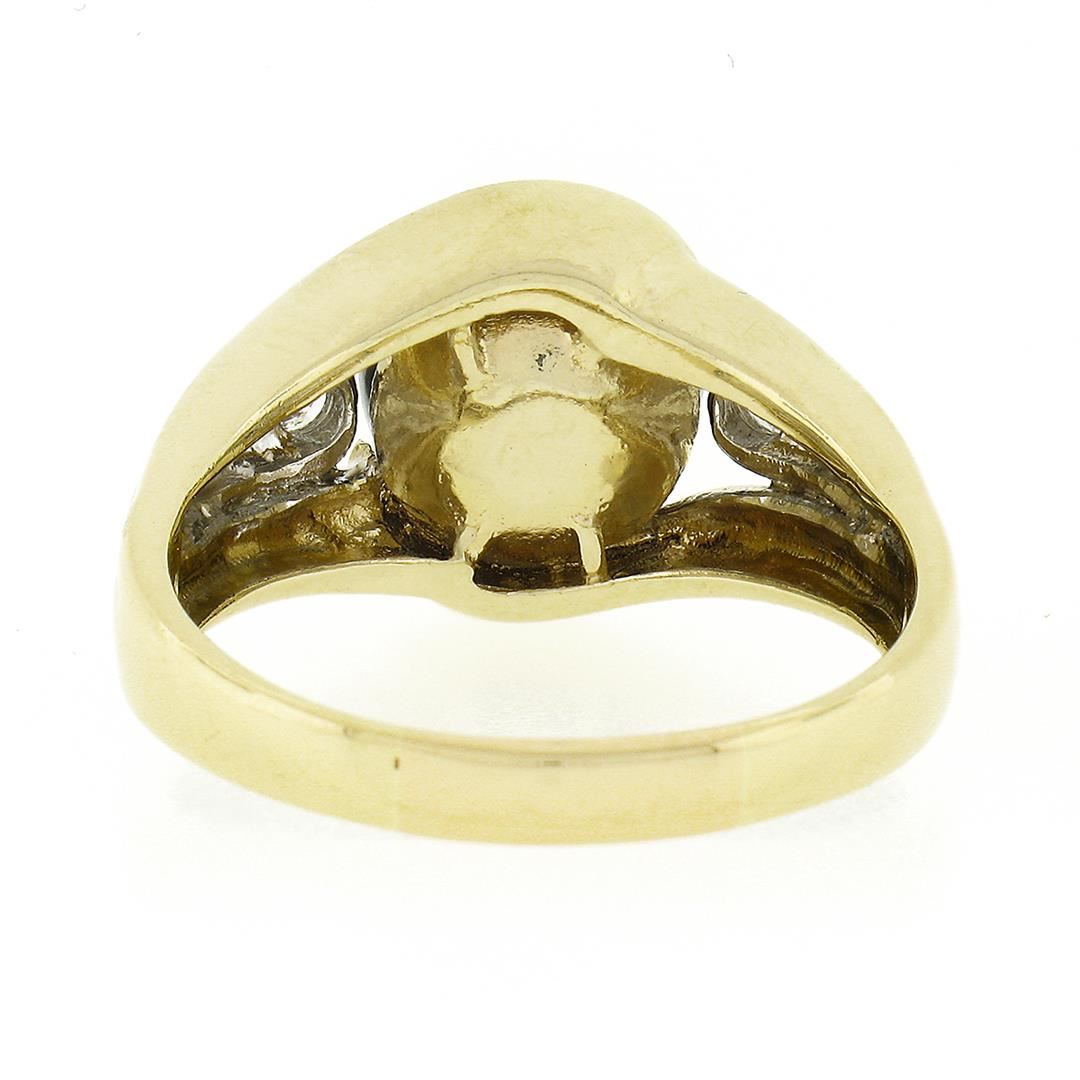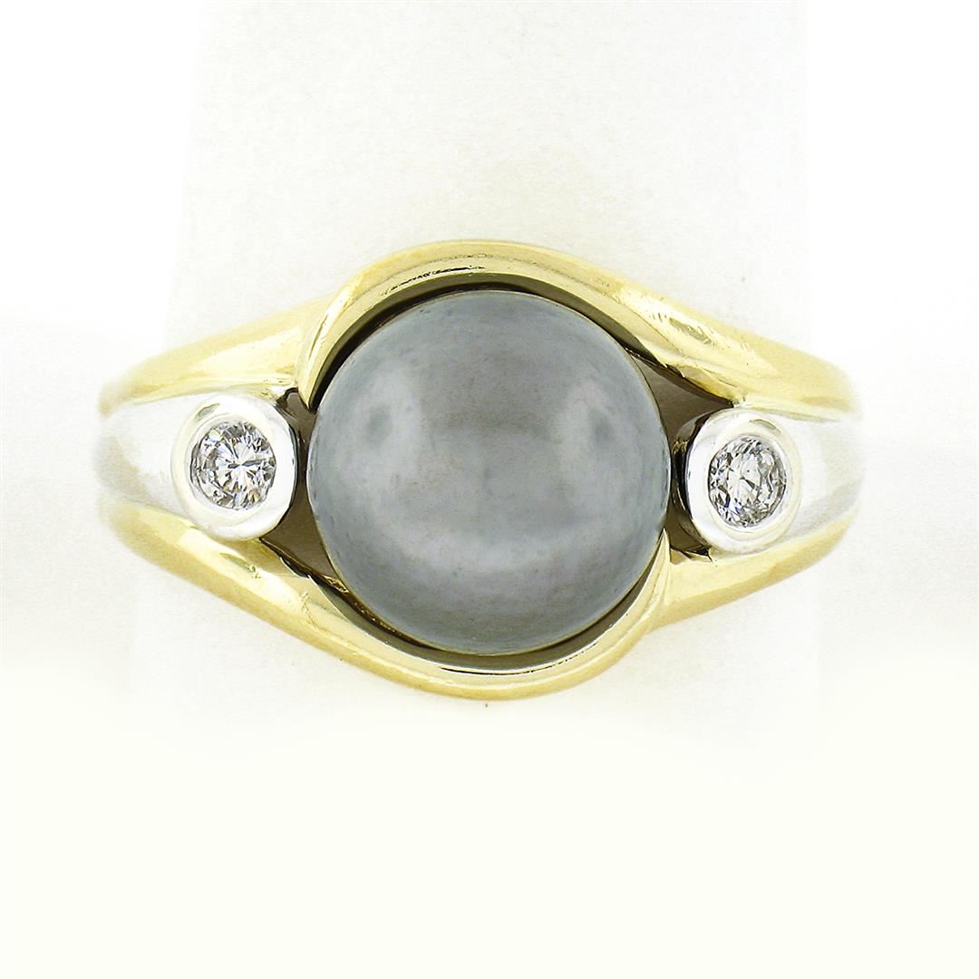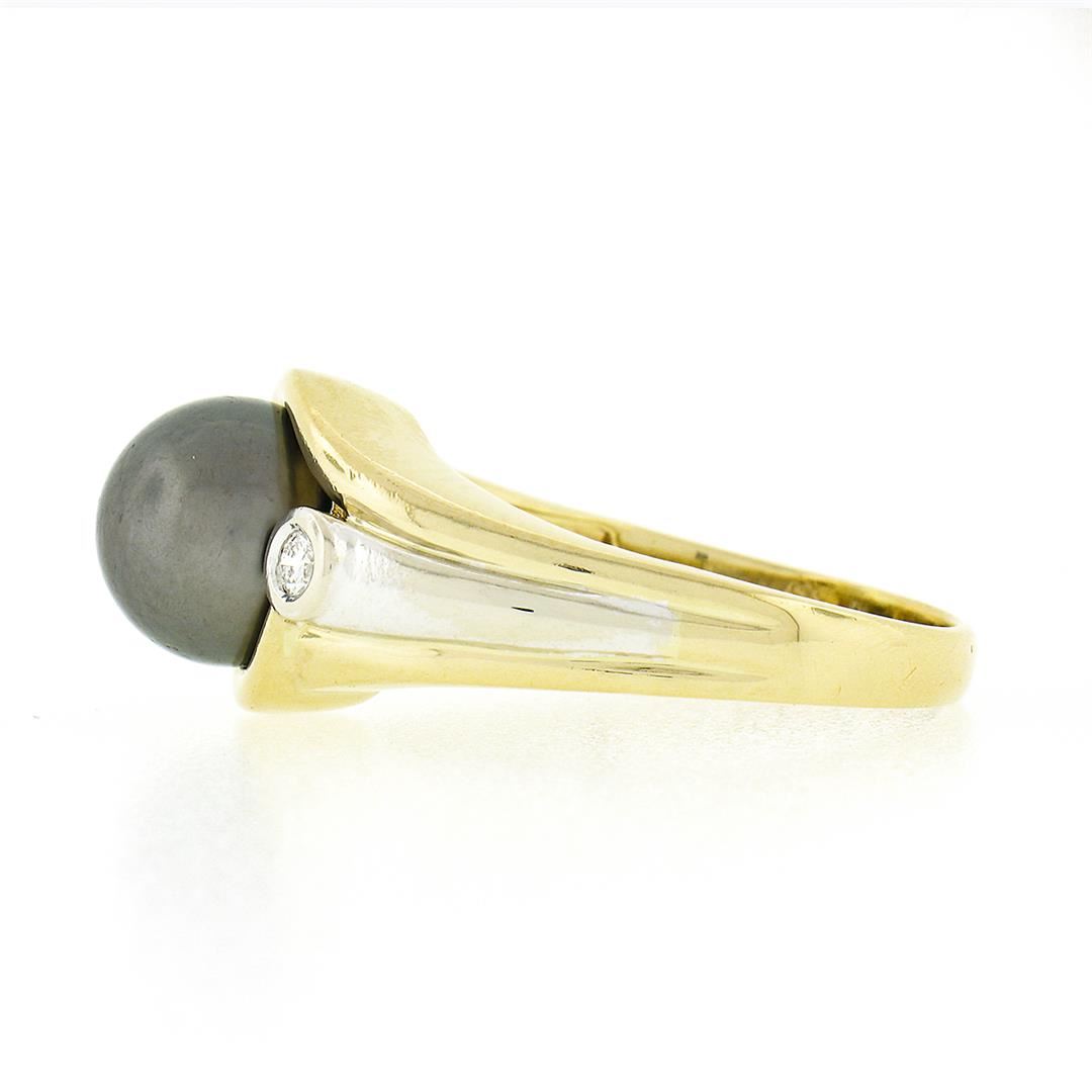 A solid 14k yellow & white gold ring, with 1 round shape tahitian cultured pearl (10.1mm), and 2 round brilliant cut natural diamonds (H - VS2 ; 0.18ctw). The ring is size 10.5, weighs a total of 8.0 grams, and measures 12.85mm wide.