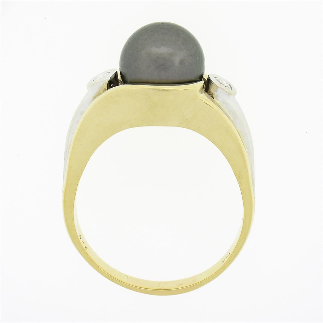 A solid 14k yellow & white gold ring, with 1 round shape tahitian cultured pearl (10.1mm), and 2 round brilliant cut natural diamonds (H - VS2 ; 0.18ctw). The ring is size 10.5, weighs a total of 8.0 grams, and measures 12.85mm wide.