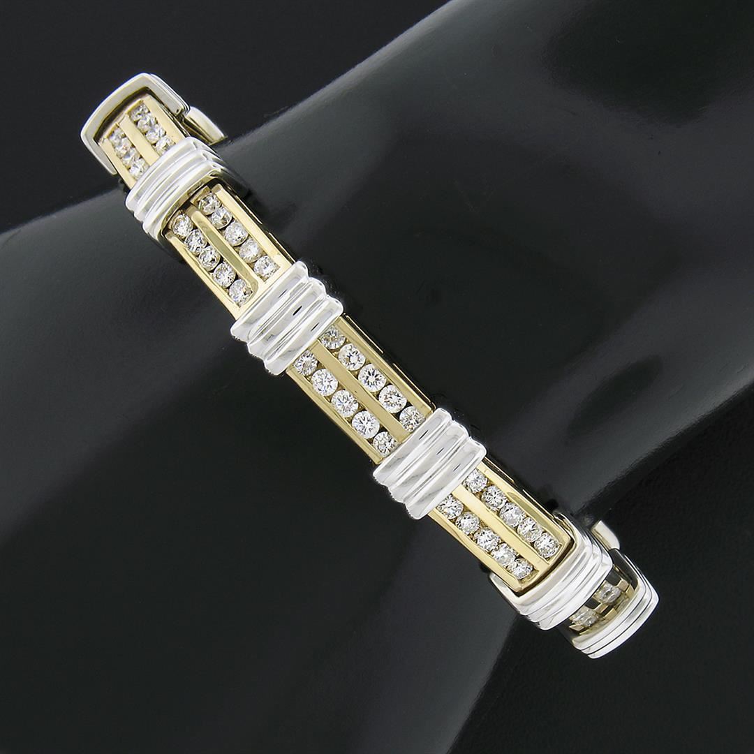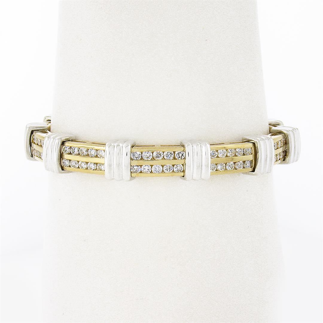 A new solid 14k yellow and white gold tennis link bracelet, with 110 round brilliant cut natural diamonds (G/H - VS1/VS2 ; 3.50ctw). It weighs a total of 38.18 grams, measures 9.1mm wide, and measures 7 inches in length.