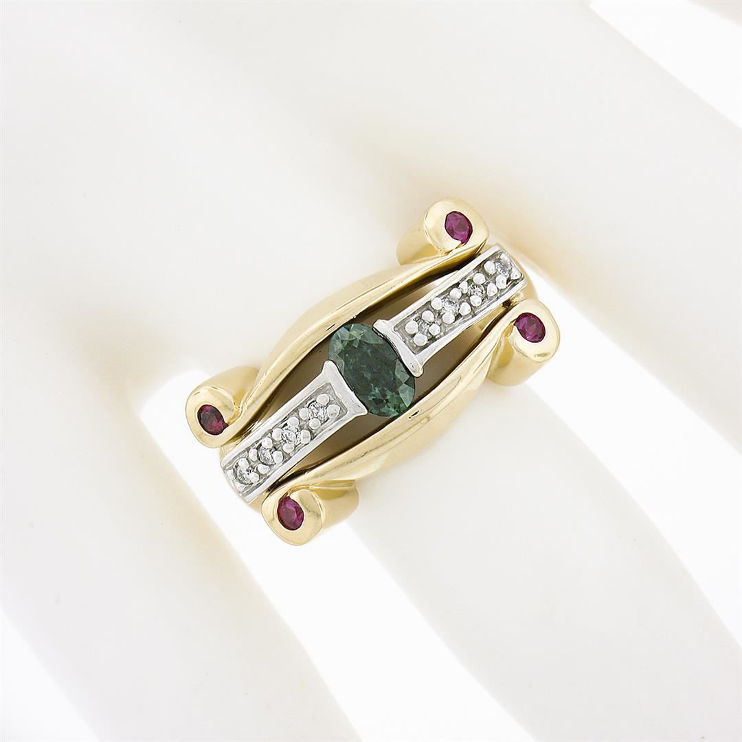 A solid 14k yellow and white gold scroll ring, with 1 oval cut natural sapphire (6x4mm - 0.60ct ), and 4 round brilliant cut natural rubies (0.20ctw), and 8 round brilliant cut natural diamonds (G/H - SI1/SI2 ; 0.12ctw). The ring is size 8.0, weighs a total of 7.58 grams, and measures 11.60mm wide.