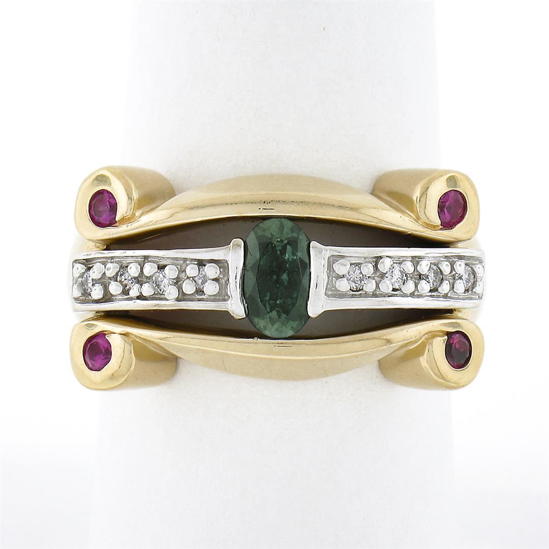A solid 14k yellow and white gold scroll ring, with 1 oval cut natural sapphire (6x4mm - 0.60ct ), and 4 round brilliant cut natural rubies (0.20ctw), and 8 round brilliant cut natural diamonds (G/H - SI1/SI2 ; 0.12ctw). The ring is size 8.0, weighs a total of 7.58 grams, and measures 11.60mm wide.