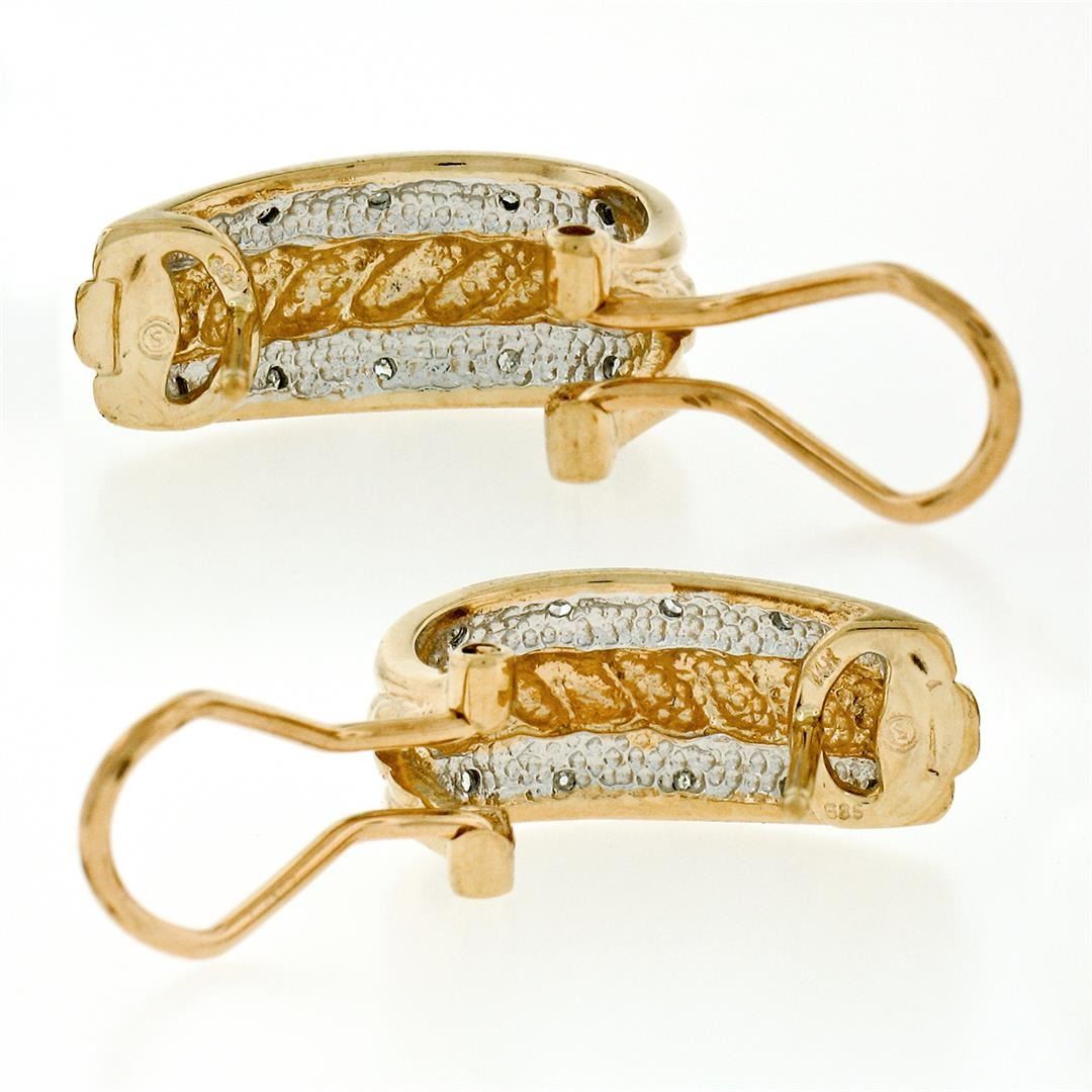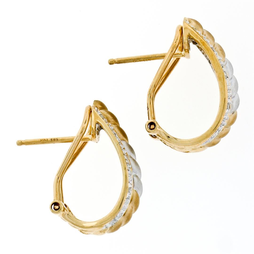 14K TT Gold Dual Row Pave Diamond & Ribbed Matte Finished Center Huggie Earrings. Please see photos and description for all available information. An estate solid 14k yellow and white gold huggie earrings, with 20 round single cut natural diamonds (H- VS2 ; 0.10ctw). The earrings measure approximately 19.50x8.40mm and weigh a total of 6.04 grams.