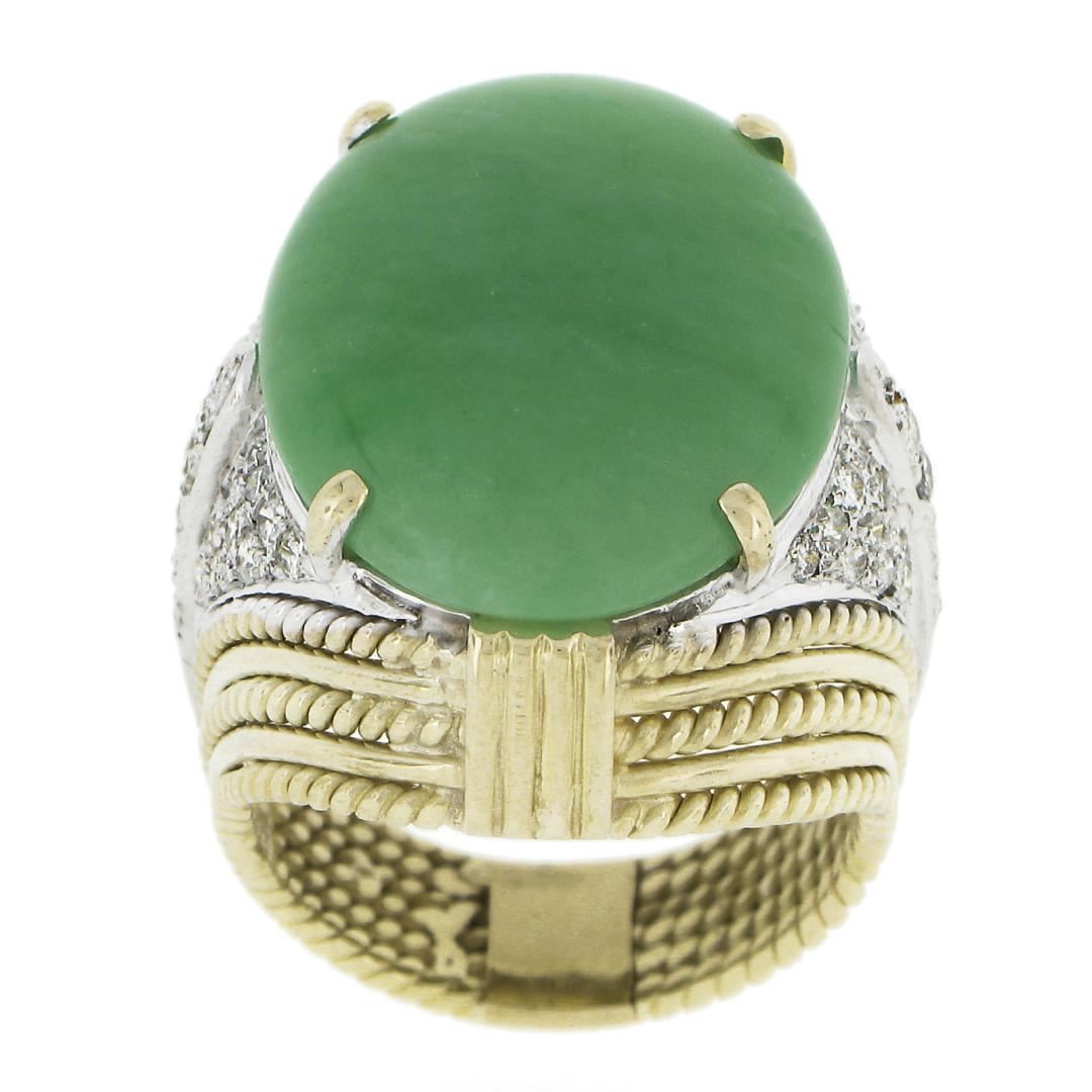 A solid 14k yellow & white gold ring, with 1 oval cabochon cut natural jade (22.7x16.6mm), and 52 round cut natural diamonds (G-I - VS2-I2 ; 0.60ctw). The ring is size 7.0, weighs a total of 16.12 grams, and measures 27.1mm wide.