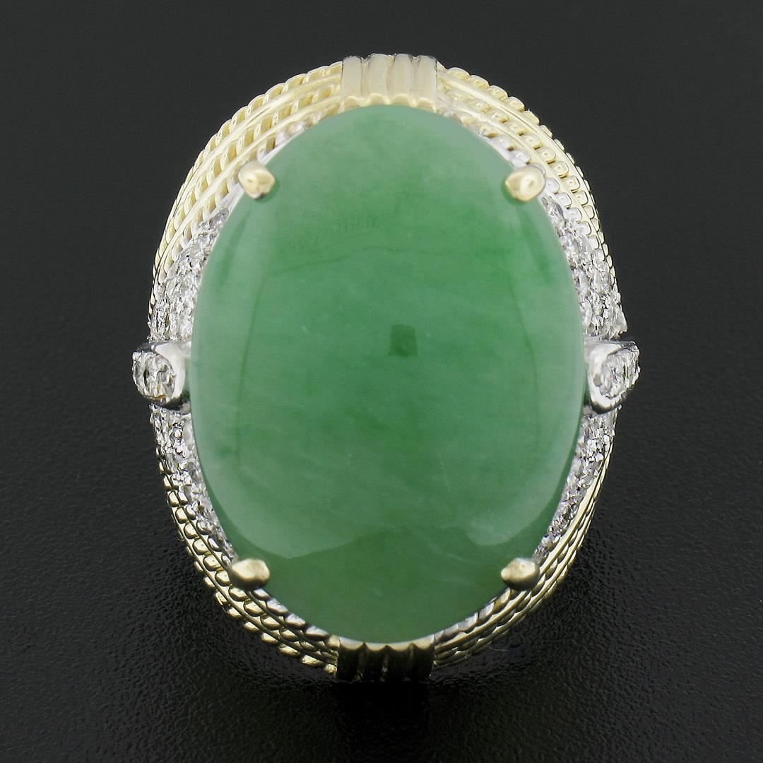 A solid 14k yellow & white gold ring, with 1 oval cabochon cut natural jade (22.7x16.6mm), and 52 round cut natural diamonds (G-I - VS2-I2 ; 0.60ctw). The ring is size 7.0, weighs a total of 16.12 grams, and measures 27.1mm wide.
