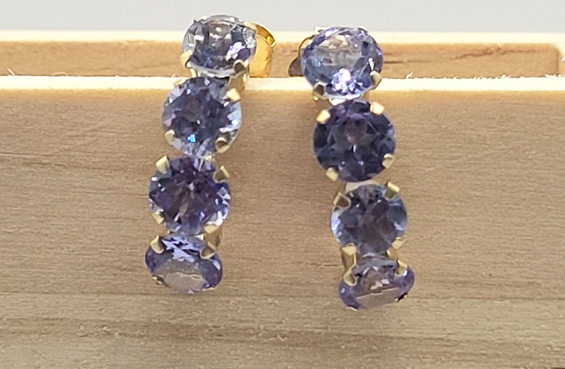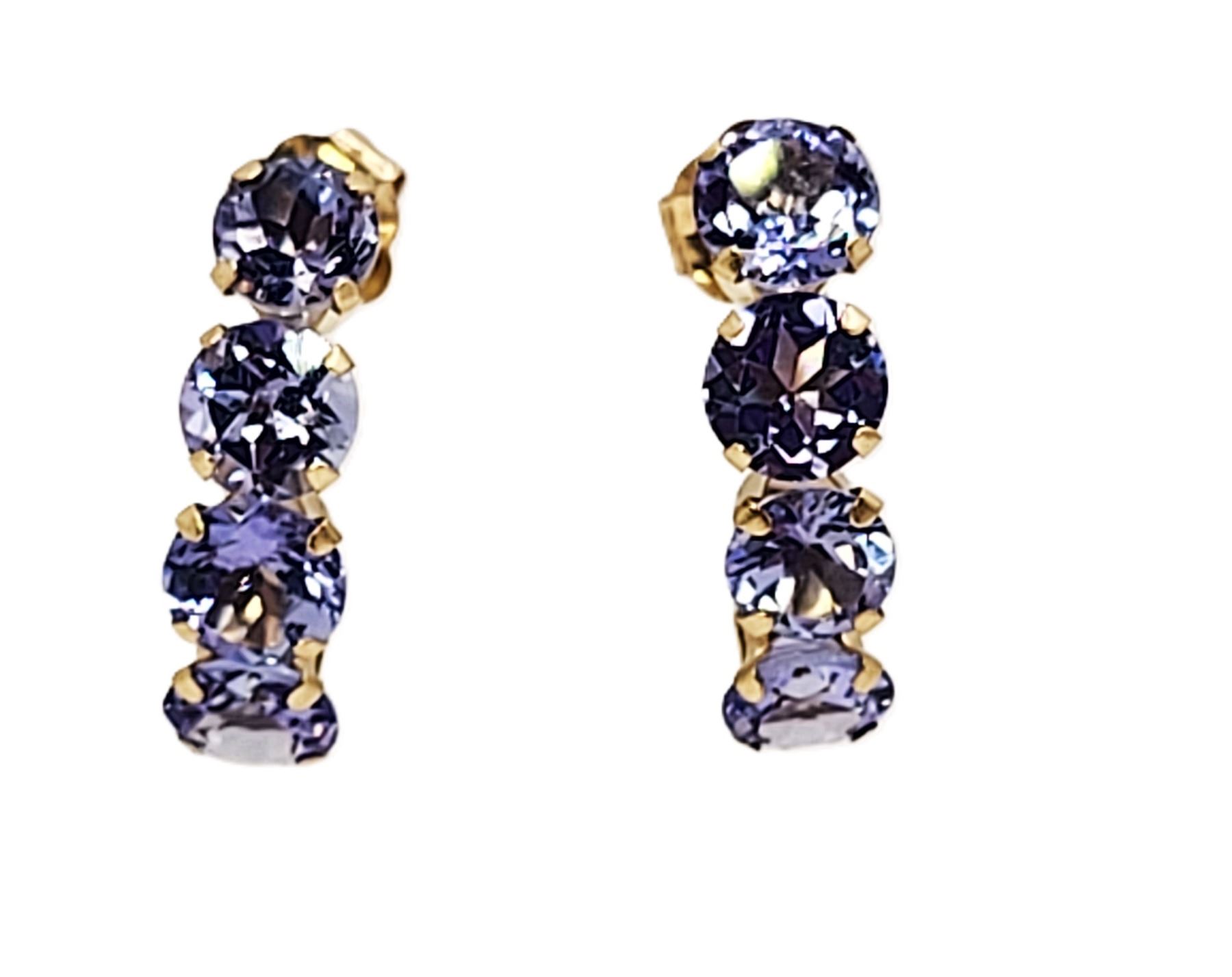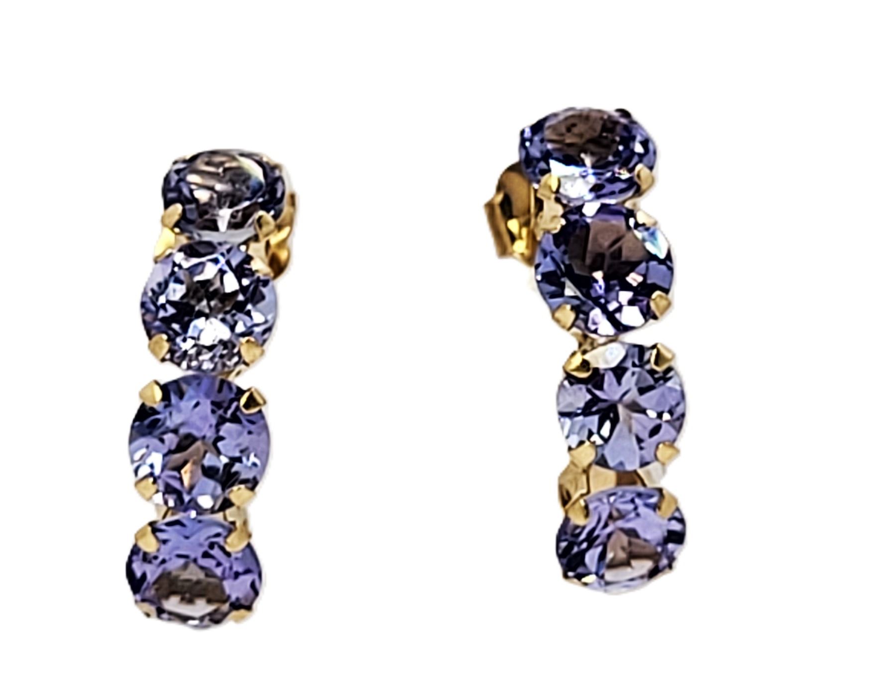 These 14 karat yellow gold earrings feature 2.00 carats total weight of round, faceted, prong-set, genuine tanzanite that are the perfect color for either winter or summer! They are approximately 5/8& quot; long and 3/16& quot; wide and attach to the earlobe with posts and friction backs. Admin:G11241/29brt