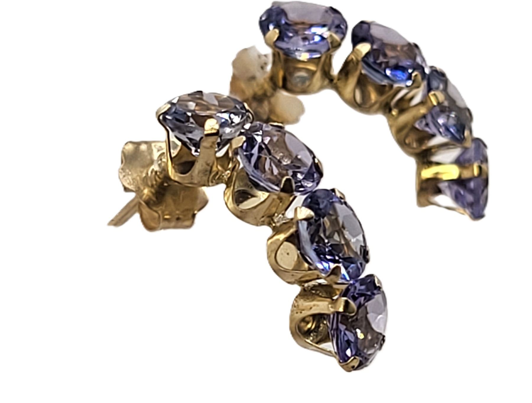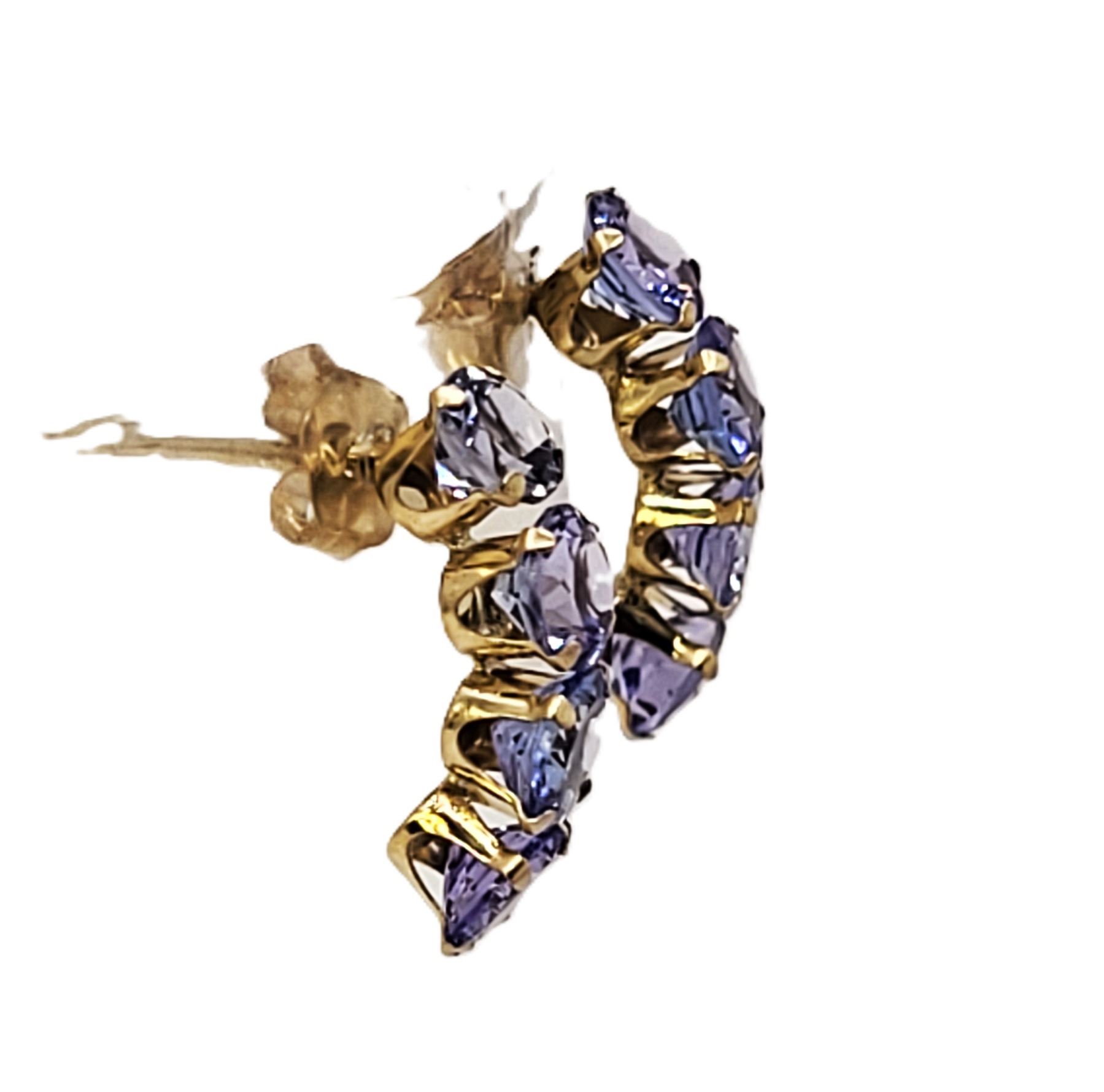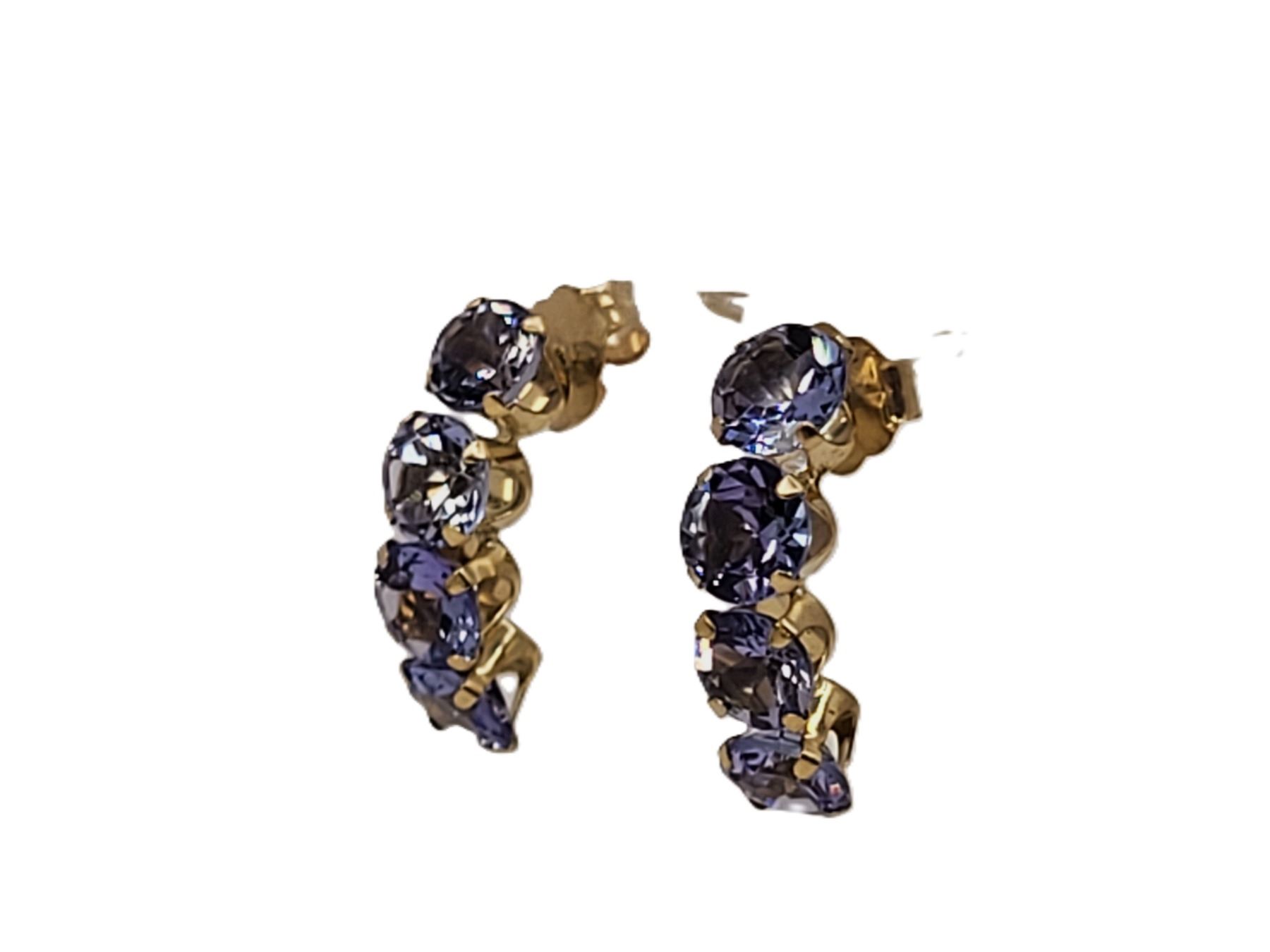 These 14 karat yellow gold earrings feature 2.00 carats total weight of round, faceted, prong-set, genuine tanzanite that are the perfect color for either winter or summer! They are approximately 5/8& quot; long and 3/16& quot; wide and attach to the earlobe with posts and friction backs. Admin:G11241/29brt