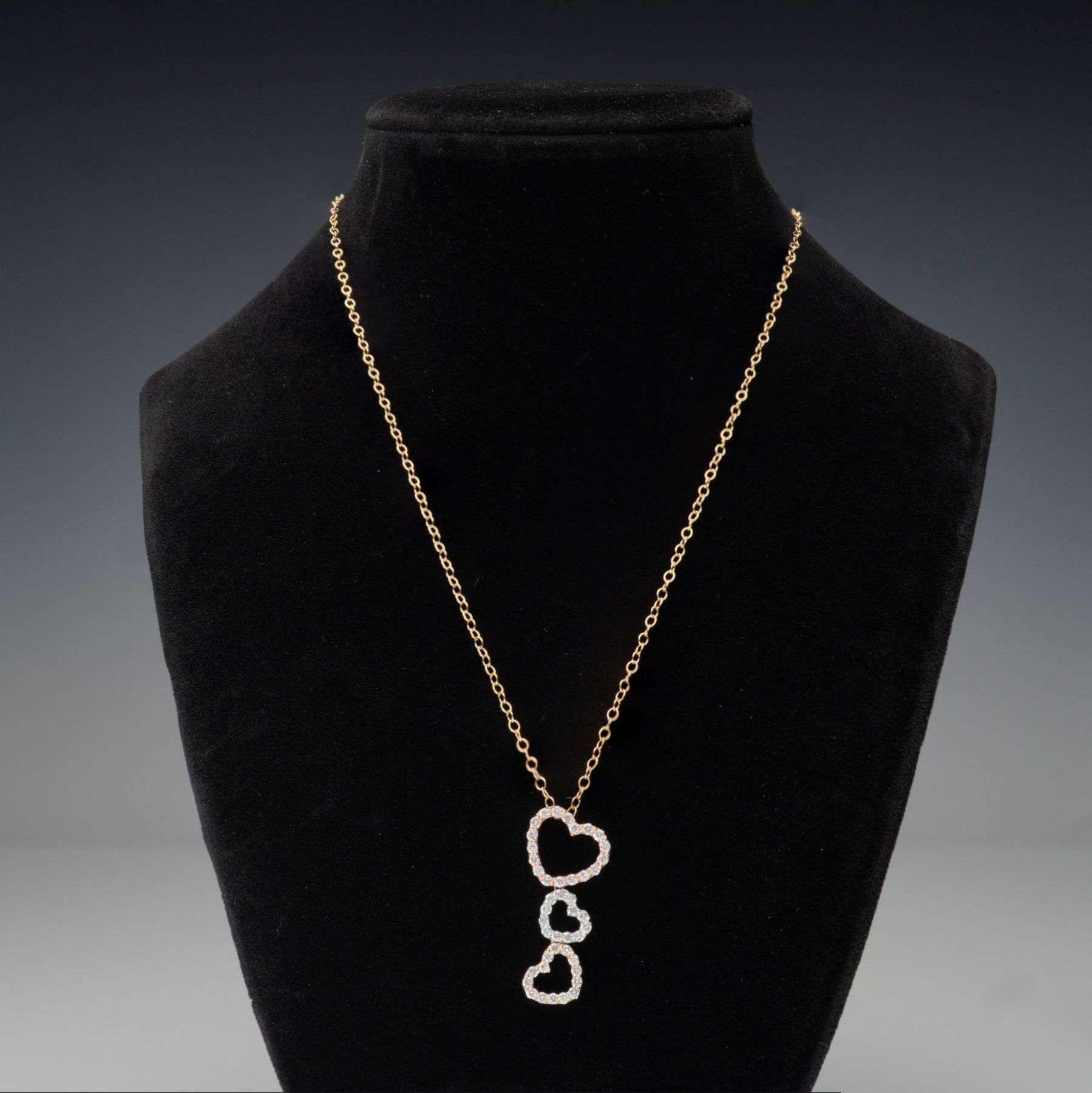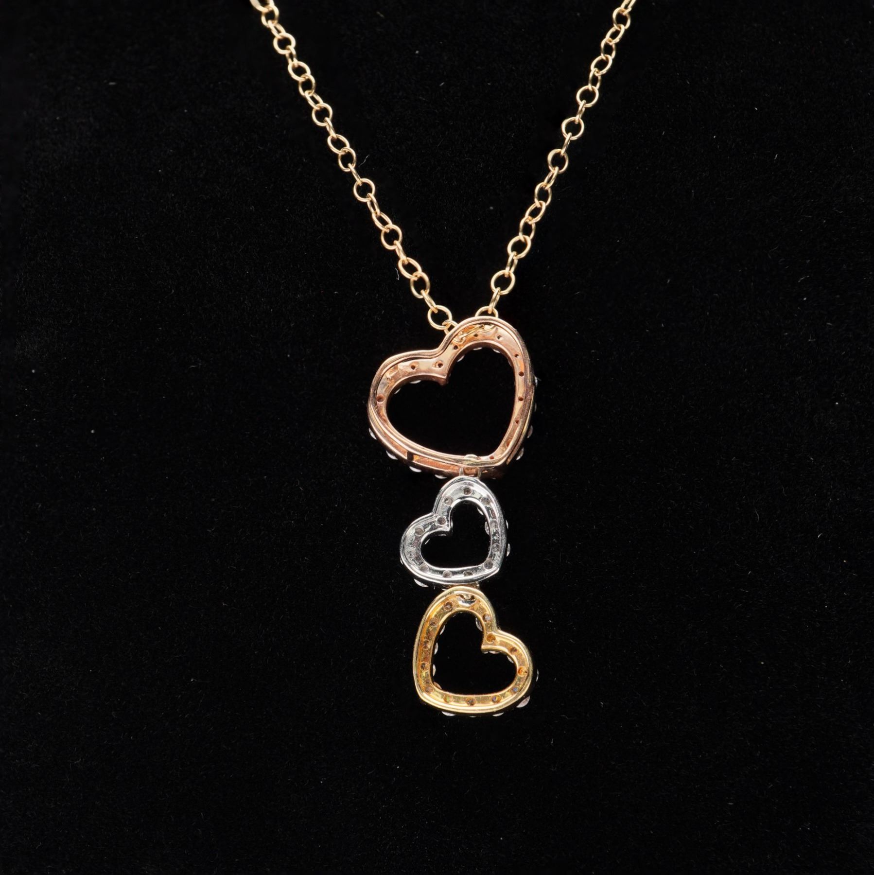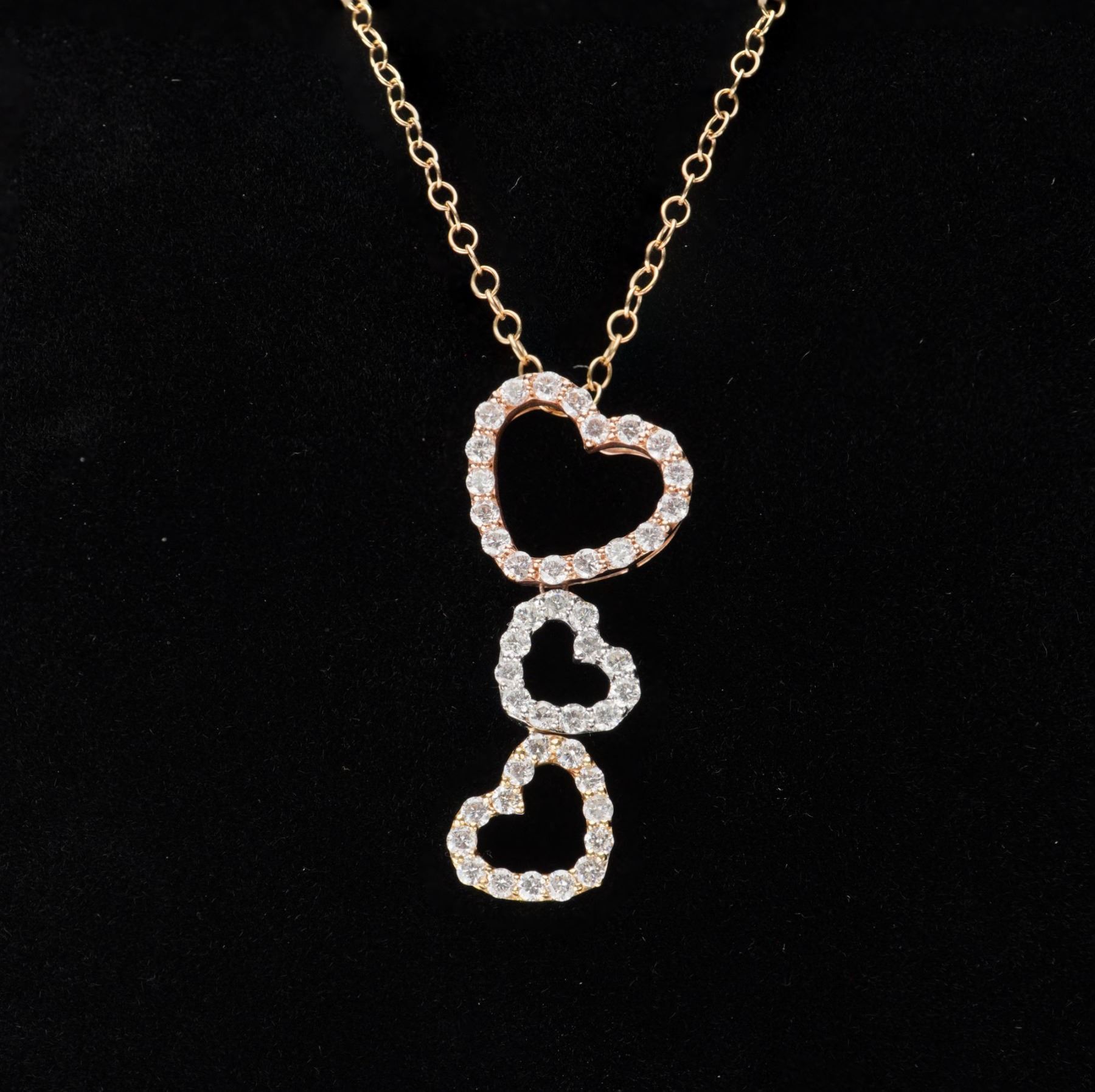 A lovely 14K tri-color gold necklace featuring a cascading pendant of three open hearts, each crafted in rose, white, and yellow gold. The pendant is adorned with round brilliant-cut white diamonds totaling approximately 0.94 carat, offering radiant sparkle across the design. Suspended from a 14K yellow gold chain with a spring ring clasp, this piece beautifully combines warmth, contrast, and timeless charm. Total combined weight: 3.86g.