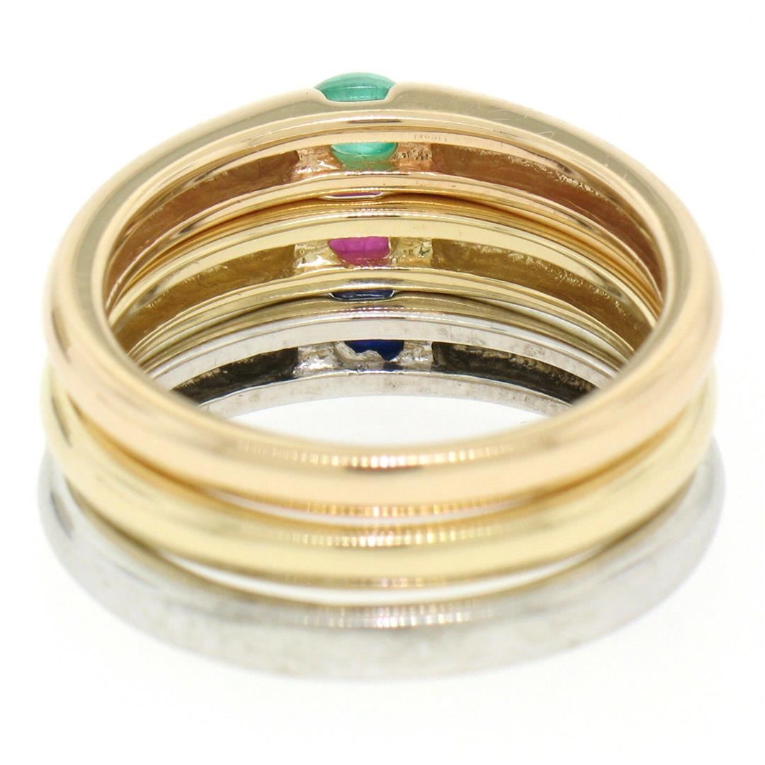 One 14K Tri-Color Gold 3 Stackable Tension Set Emerald Sapphire Ruby Solitaire Rings. Item Details: Material: Solid 14K White, Yellow, and Rose Gold, Weight: 7.4 Grams (all together), Stone(s): (1) Natural Genuine Emerald - Cabochon Cut - Tension Set - Green Color - 0.20ct (approx.), (1) Natural Genuine Ruby - Cabochon Cut - Tension Set - Red Color - 0.30ct (approx.), (1) Natural Genuine Sapphire - Cabochon Cut - Tension Set - Blue Color - 0.30ct (approx.), Total Carat Weight: 0.80 (approx.), Ring Size: 6.5, Ring Width: 3.10mm (each), 9.5 (all together). Ring Height: 4.25mm rise off the finger. Condition: Like New!