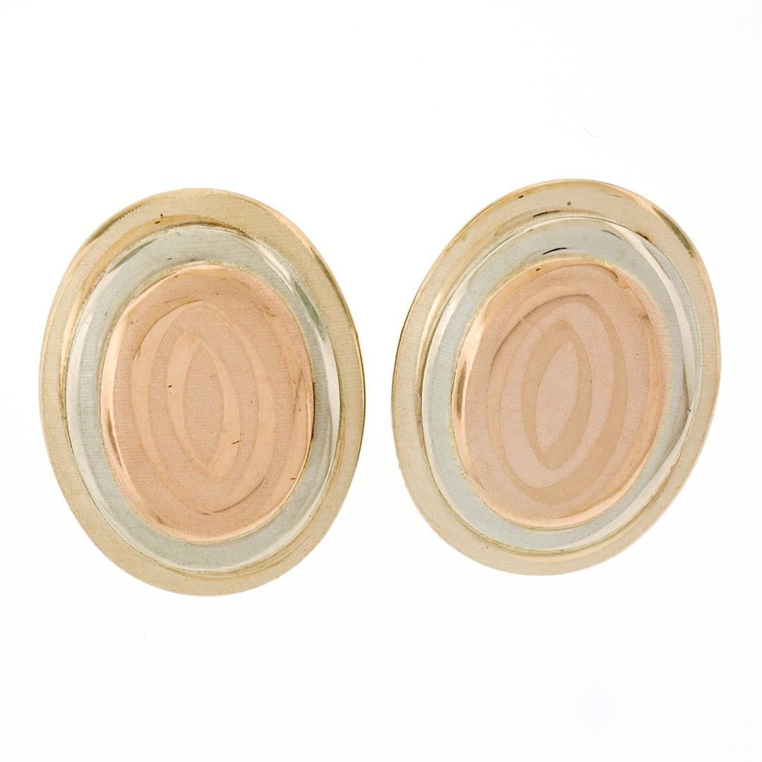 14K Tri Color Gold Dual Finished Tiered Oval Pattern Disk Button Stud Earrings. Please see photos and description for all available information. A new solid 14k tri color button stud earrings.The earrings measure approximately 18.20x23mm and weigh a total of 5.40 grams.