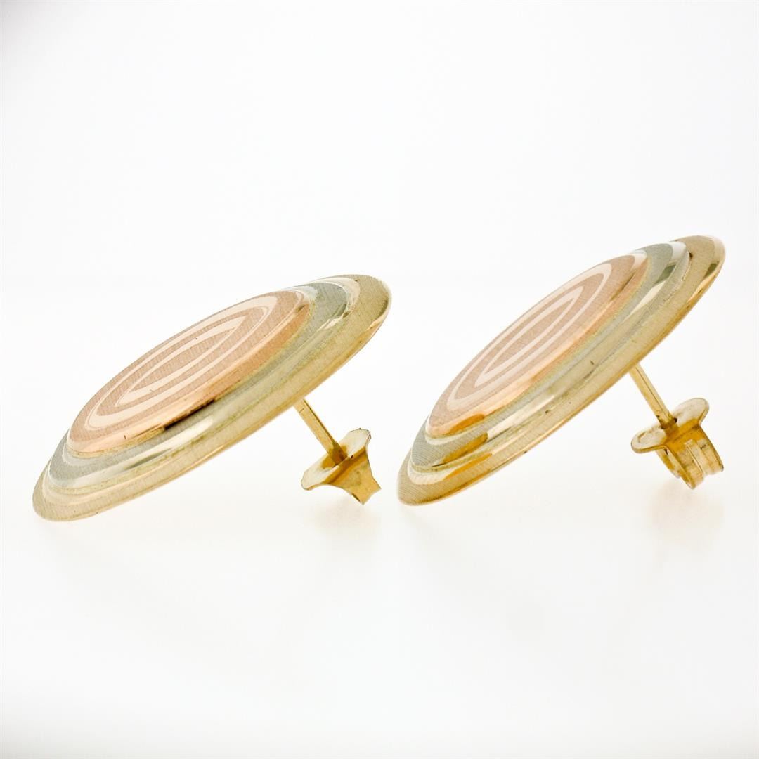 14K Tri Color Gold Dual Finished Tiered Oval Pattern Disk Button Stud Earrings