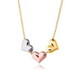 Three expertly crafted hearts, one each in 14K yellow, white, and rose gold gracefully slide along a 17'' rolo chain. Each heart features a unique finish with areas of bright polish contrasting with a satin finish, lending emphasis to the depth of the form. Romantic and feminine, this necklace evokes sweet sentimentality.Rhodium Polish: NoLine Item Type: GoldMetal Name: Tri-Color GoldMetal Content: 14KStyle Name: HeartWidth: 0.08 iClasp: Spring RingChain Type: Rolo