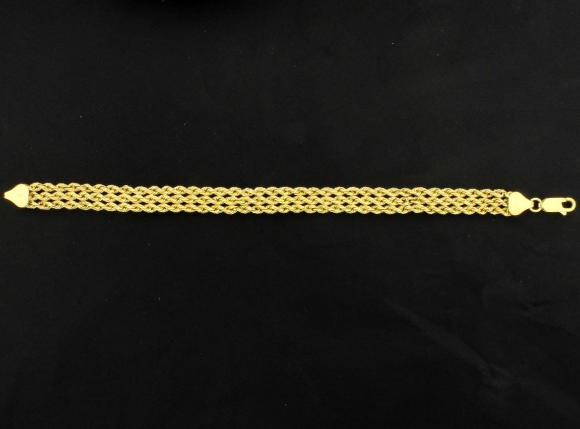 In 14K yellow gold it is 6 3/4 inches long and 7.5mm wide. 5.6g
