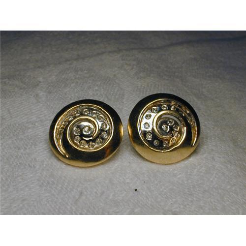 You are looking at a gorgeous pair of 14K yellow and white gold swirl earrings with diamonds. Each earring has 16 round diamonds, each measuring 1 mm in diameter. The weight of the pair is 7.9 grams. The backings are solid yellow gold posts. Each earring measures 3/4 inch in diameter. They are in mint condition.