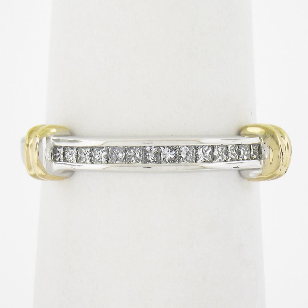 A solid 14k yellow & white gold band ring, with 14 princess cut natural diamonds (H/I - VS1-SI1 ; 0.25ctw). The ring is size 7.0, weighs a total of 3.16 grams, and measures 2.9mm wide.