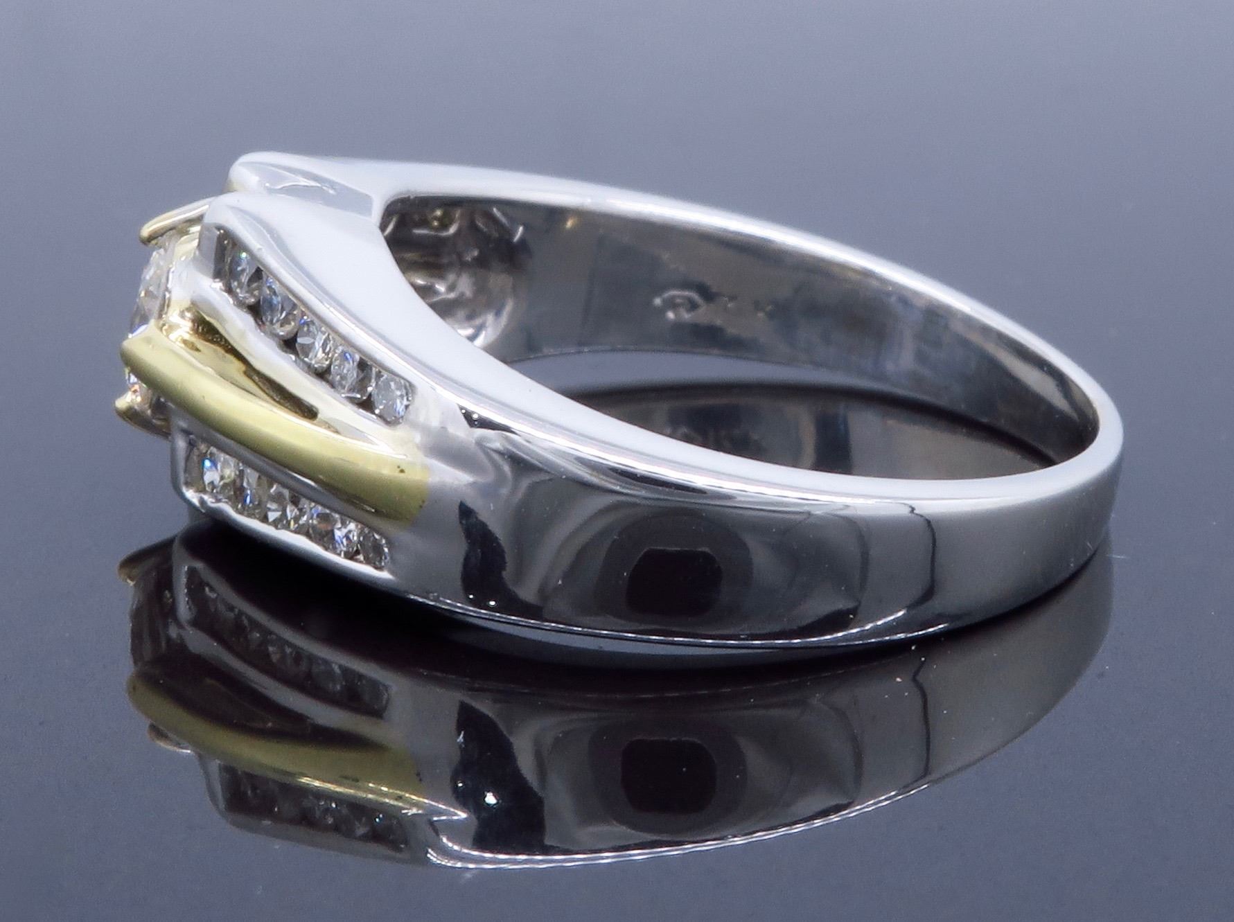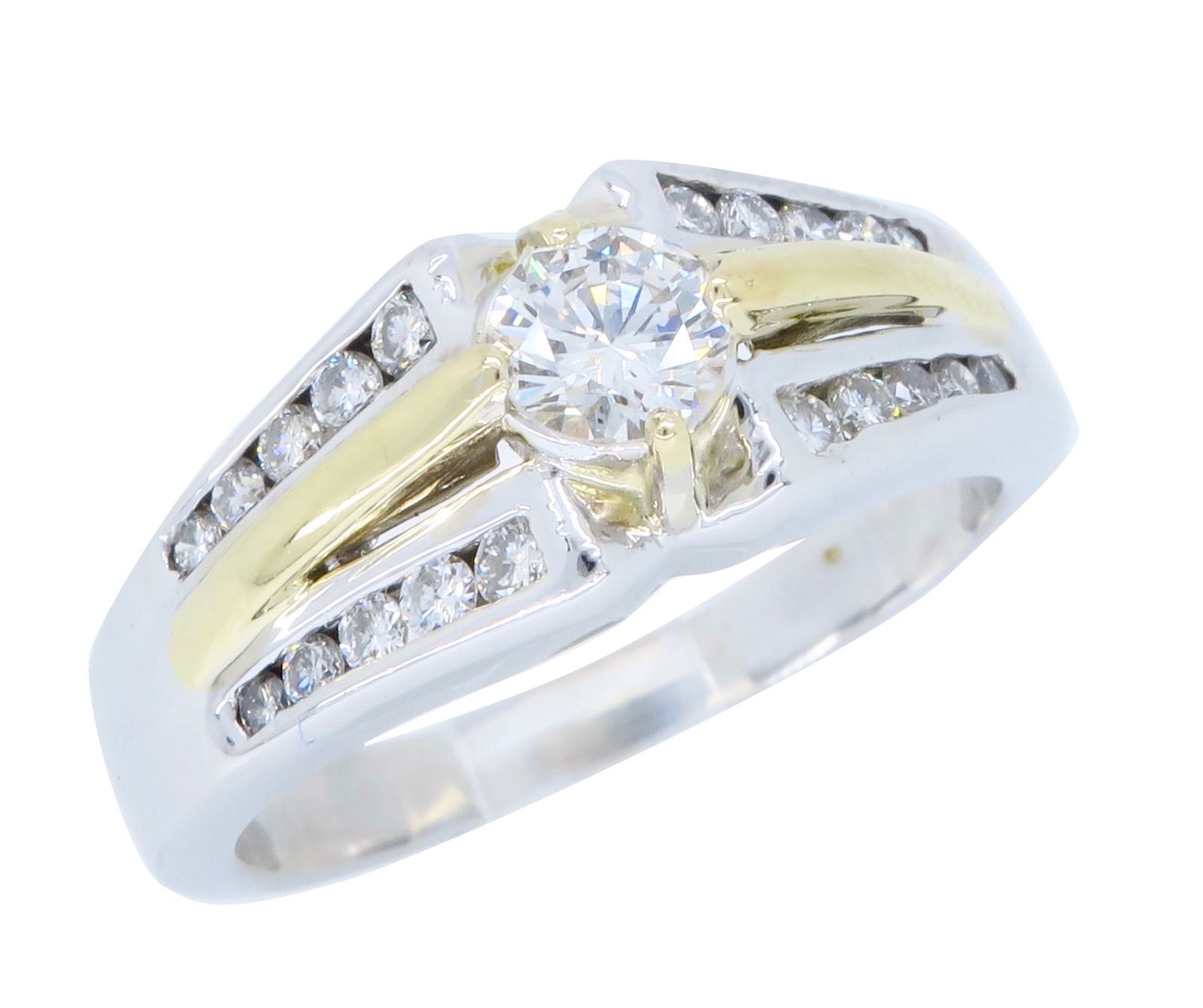 One 14K Two Tone Gold 0.65ctw Diamond Ring. (1) Round Diamond with a total weight of 0.33cts with a color of G-H and clarity of SI-1. Side round Diamonds with a total weight of 0.32cts. Total weight of this ring is 5.8 grams.