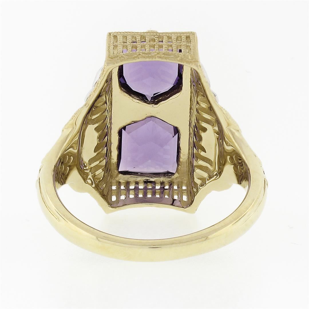 A new solid 14k yellow & white gold platter ring, with 2 custom cut natural amethysts (1.76ctw), and 2 round brilliant cut natural diamonds (G - VS2 ; 0.04ctw ). The ring is size 6.5, weighs a total of 5.80 grams, and measures 17.2mm wide.