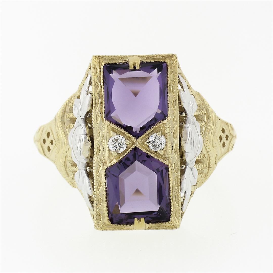 A new solid 14k yellow & white gold platter ring, with 2 custom cut natural amethysts (1.76ctw), and 2 round brilliant cut natural diamonds (G - VS2 ; 0.04ctw ). The ring is size 6.5, weighs a total of 5.80 grams, and measures 17.2mm wide.
