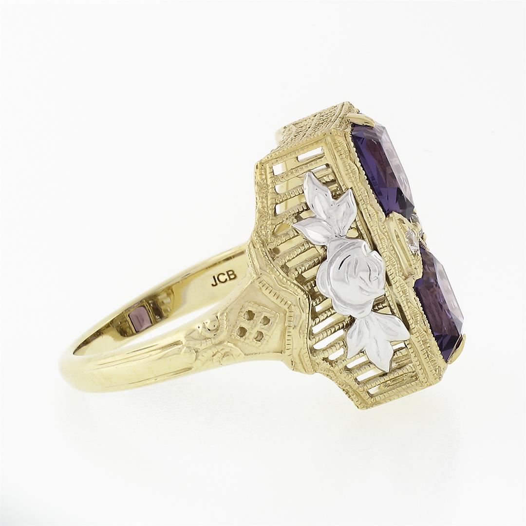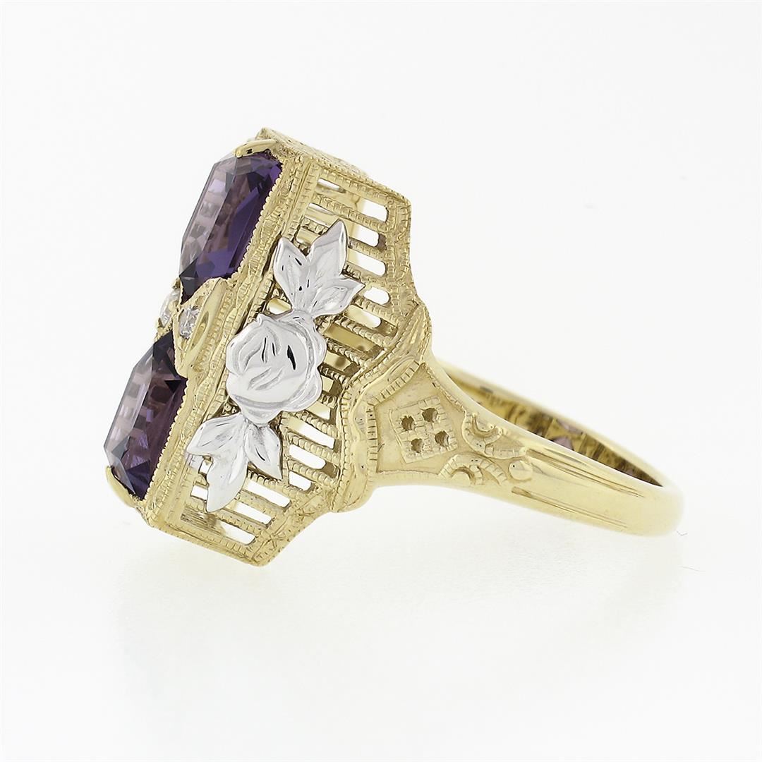 A new solid 14k yellow & white gold platter ring, with 2 custom cut natural amethysts (1.76ctw), and 2 round brilliant cut natural diamonds (G - VS2 ; 0.04ctw ). The ring is size 6.5, weighs a total of 5.80 grams, and measures 17.2mm wide.