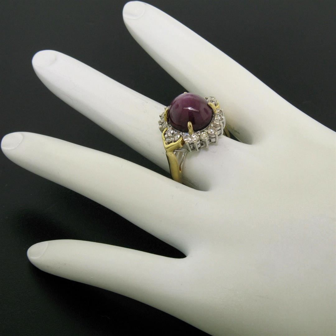One 14K Two Tone Gold 11.60ctw Cabochon Star Ruby & Champagne Diamond Cocktail Ring. Item Details: Material: 14K Solid Yellow & White Gold, Weight: 8.0 Grams, Stone(s): (1) Natural Genuine Star Ruby - Oval Cabochon Cut - Prong Set - Unique Violet-Red Color - 11.0x10.4mm / 10.75ct (approx.) STAR IS VIVID IN PERSON!, (20) Natural Genuine Diamonds - Round Brilliant Cut - Prong Set - Light Champagne Color - VS1/VS2 Clarity - 0.85ctw (approx.), Total Carat Weight: 11.60 (approx.), Ring Size: 7.5, Ring Width: 17.50mm, Ring Height: 11.82mm rise off the finger. Condition: Estate ring - Excellent condition!