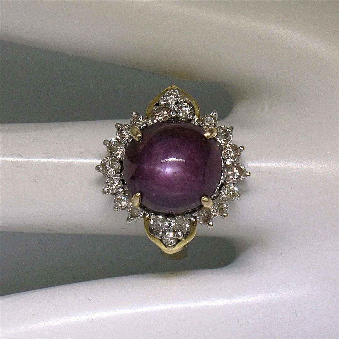 One 14K Two Tone Gold 11.60ctw Cabochon Star Ruby & Champagne Diamond Cocktail Ring. Item Details: Material: 14K Solid Yellow & White Gold, Weight: 8.0 Grams, Stone(s): (1) Natural Genuine Star Ruby - Oval Cabochon Cut - Prong Set - Unique Violet-Red Color - 11.0x10.4mm / 10.75ct (approx.) STAR IS VIVID IN PERSON!, (20) Natural Genuine Diamonds - Round Brilliant Cut - Prong Set - Light Champagne Color - VS1/VS2 Clarity - 0.85ctw (approx.), Total Carat Weight: 11.60 (approx.), Ring Size: 7.5, Ring Width: 17.50mm, Ring Height: 11.82mm rise off the finger. Condition: Estate ring - Excellent condition!