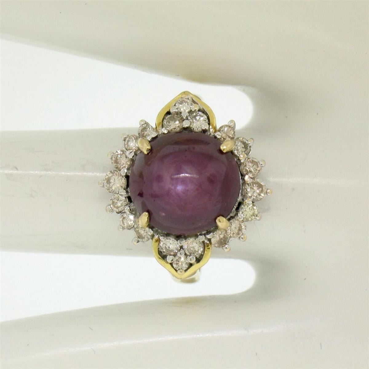 One 14K Two Tone Gold 11.60ctw Cabochon Star Ruby & Champagne Diamond Cocktail Ring. Item Details: Material:  14K Solid Yellow & White Gold, Weight:  8.0 Grams, Stone(s):  (1) Natural Genuine Star Ruby - Oval Cabochon Cut - Prong Set - Unique Violet-Red Color - 11.0x10.4mm / 10.75ct (approx.) STAR IS VIVID IN PERSON!, (20) Natural Genuine Diamonds - Round Brilliant Cut - Prong Set - Light Champagne Color - VS1/VS2 Clarity - 0.85ctw (approx.), Total Carat Weight:  11.60 (approx.), Ring Size:  7.5, Ring Width:  17.50mm, Ring Height:  11.82mm rise off the finger. Condition:  Estate ring - Excellent condition!