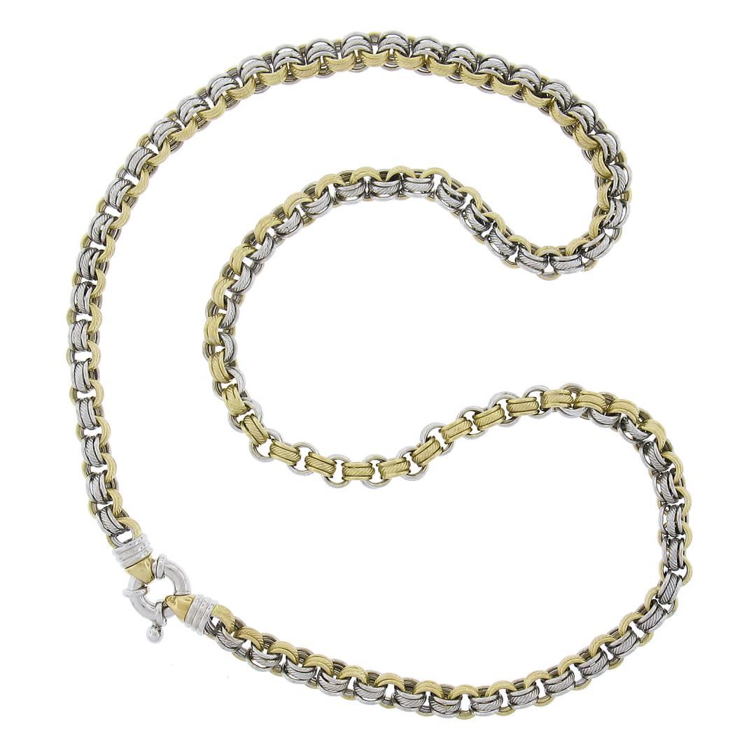 A solid 14k yellow & white gold rolo cable link necklace. It weighs a total of 42.76 grams, measures 6.5mm wide, and measures 23.5 inches in length.