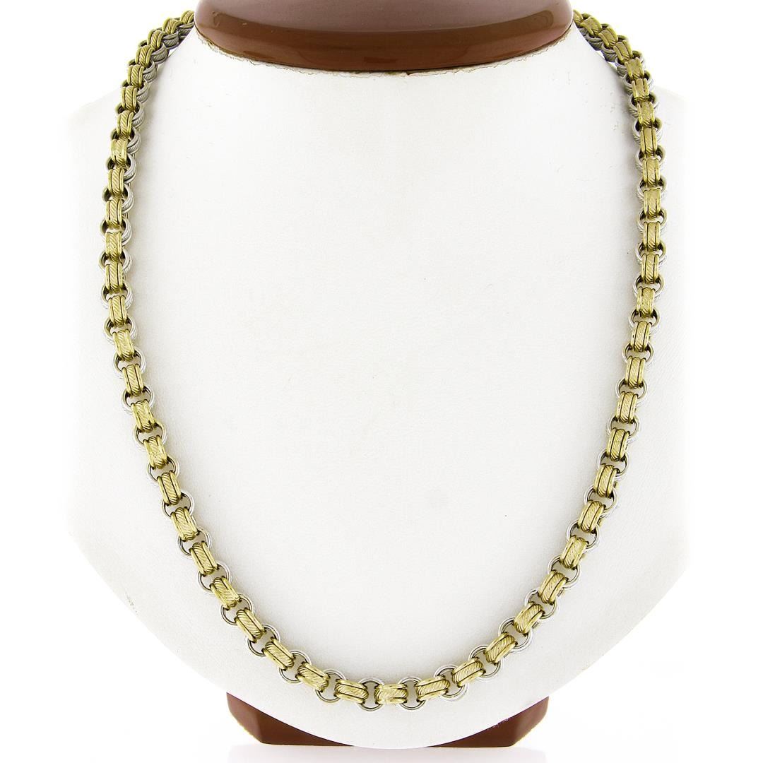 A solid 14k yellow & white gold rolo cable link necklace. It weighs a total of 42.76 grams, measures 6.5mm wide, and measures 23.5 inches in length.