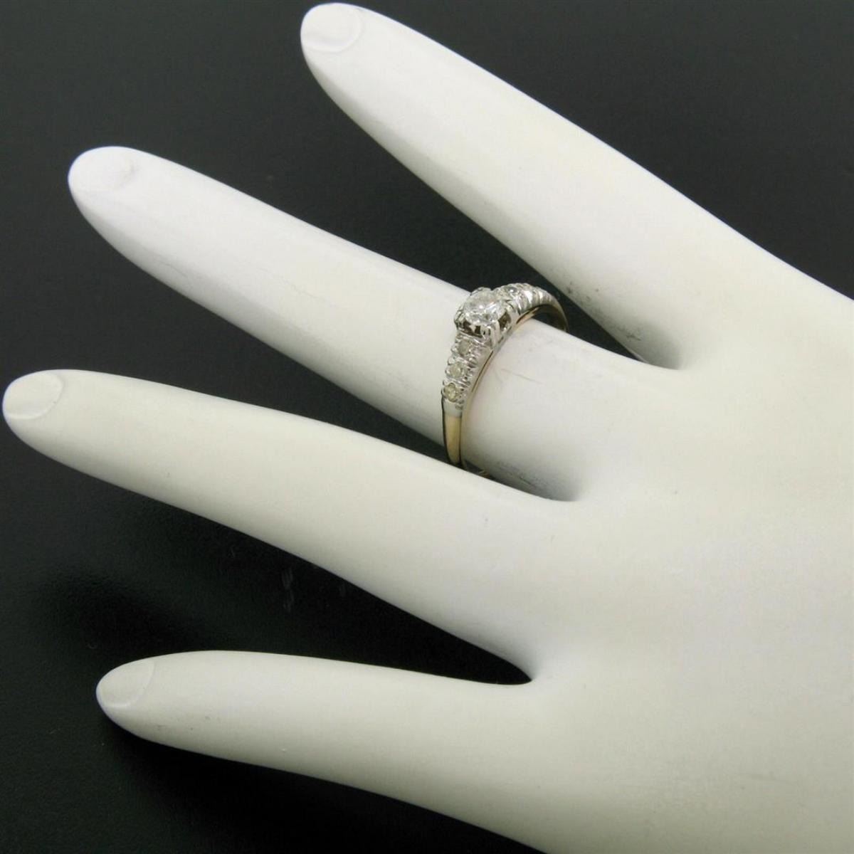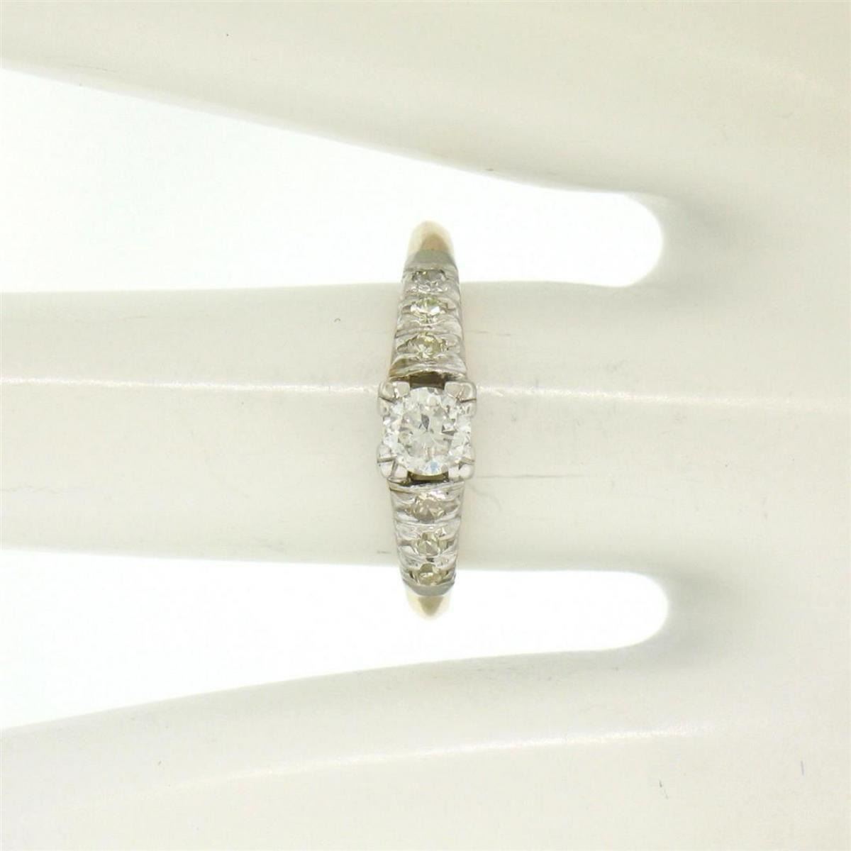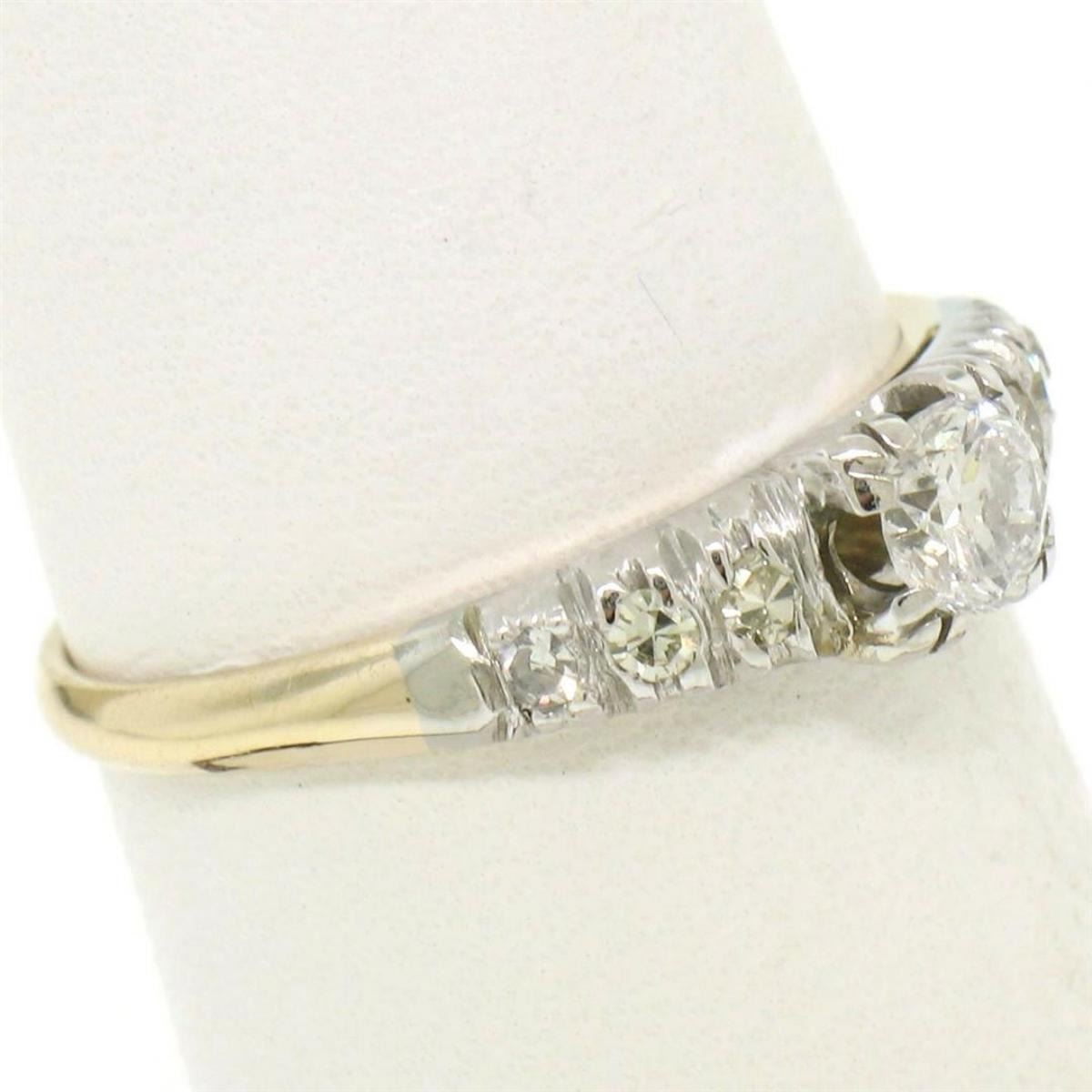 One Antique 14K Two Tone Gold .40ctw European Cut Diamond Solitaire Engagement Ring . Item Details: Material: 14K Solid Yellow and White Gold, Weight: 1.60 Grams, Stone(s): (1) Natural Genuine Diamond - European Cut - Prong Set - G Color - SI2 Clarity - 0.26ct (approx.), (6) Natural Genuine Diamonds - Round Single Cut - Pav� Set - J/K Color - SI1 Clarity - 0.14ctw (approx.), Total Carat Weight: 0.40 (approx.), Ring Size: 6.0 (We can custom size this ring.), Ring Width: 4.58mm, Ring Height: 5.22mm rise off the finger Ring Height: 5.22mm rise off the finger Condition: Antique piece. Excellent, ready to wear condition!