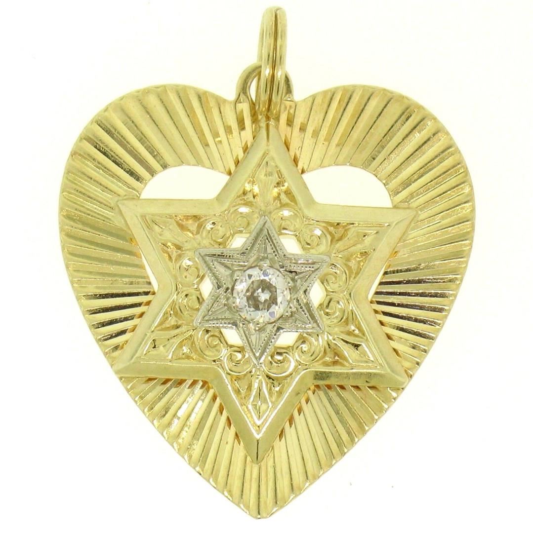 One Antique 14K Two Tone Gold Heart Star of David .22ct Old Mine Cut Diamond Pendant. Item Details: Material: 14K Solid Yellow and White Gold, Weight: 3.70 Grams, Stone(s): (1) Natural Genuine Diamond - Old Mine Cut - Prong Set - VS1 Clarity - G Color, Total Carat Weight: 0.22 (approx.), Width: 24.12mm, Height (w/ Bail): 26.53mm, Height (w/o Bail): 31.35mm, Thickness: 3.95mm