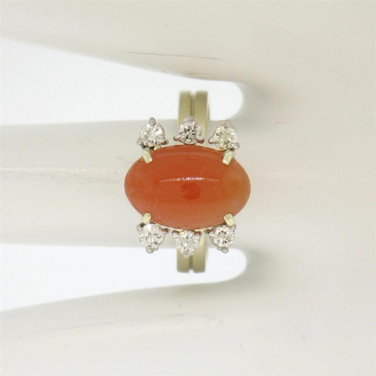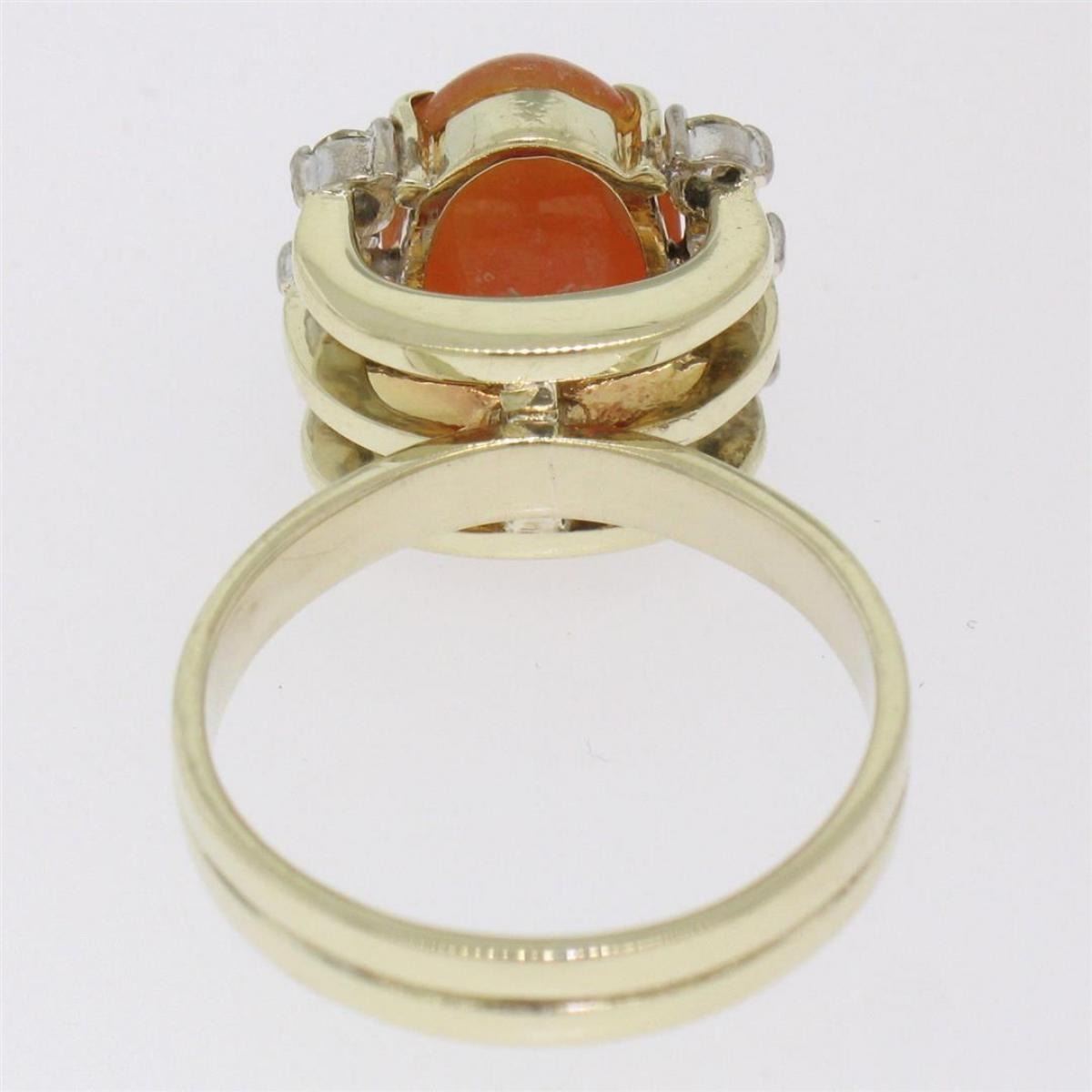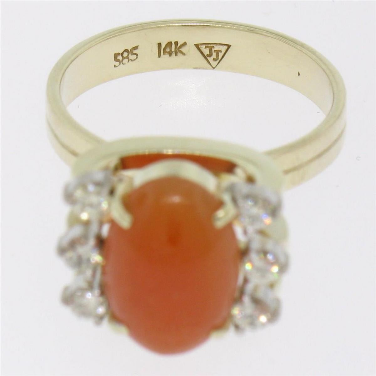 One Estate 14K Two Tone Gold Oval Carnelian Solitaire Ring w/ Round Diamond Accents. Item Details: Material: 14K Solid White & Yellow Gold, Weight: 6.7 Grams, Stone(s): (1) Natural Genuine Carnelian - Oval Shape - Prong Set - Orange Color - 12.6 x 8.5 mm, (6) Natural Genuine Diamonds - Brilliant Cut - Prong Set - H Color SI1 Clarity- 0.30Ctw (approx.), Ring Size: 7.5 (We can custom size this ring.), Ring Width: 12.6 mm, Ring Height: 13.58 mm rise off the finger, Condition: Estate Like New!