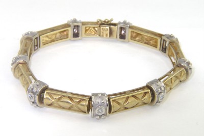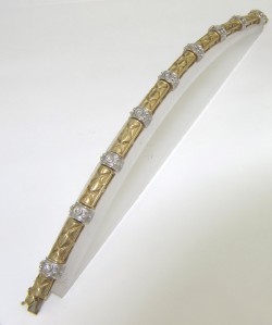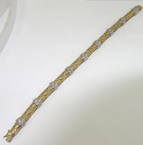 14K Two-Toned (White/Yellow) Gold, Diamond Bracelet.The total bracelet's weight is 35.2 grams.The total weight of Diamond is 0.36 ct. approximately . H color VS clarity. The Bracelet is 8" long.The bracelet is 9 mm wide and 5 mm thick.
