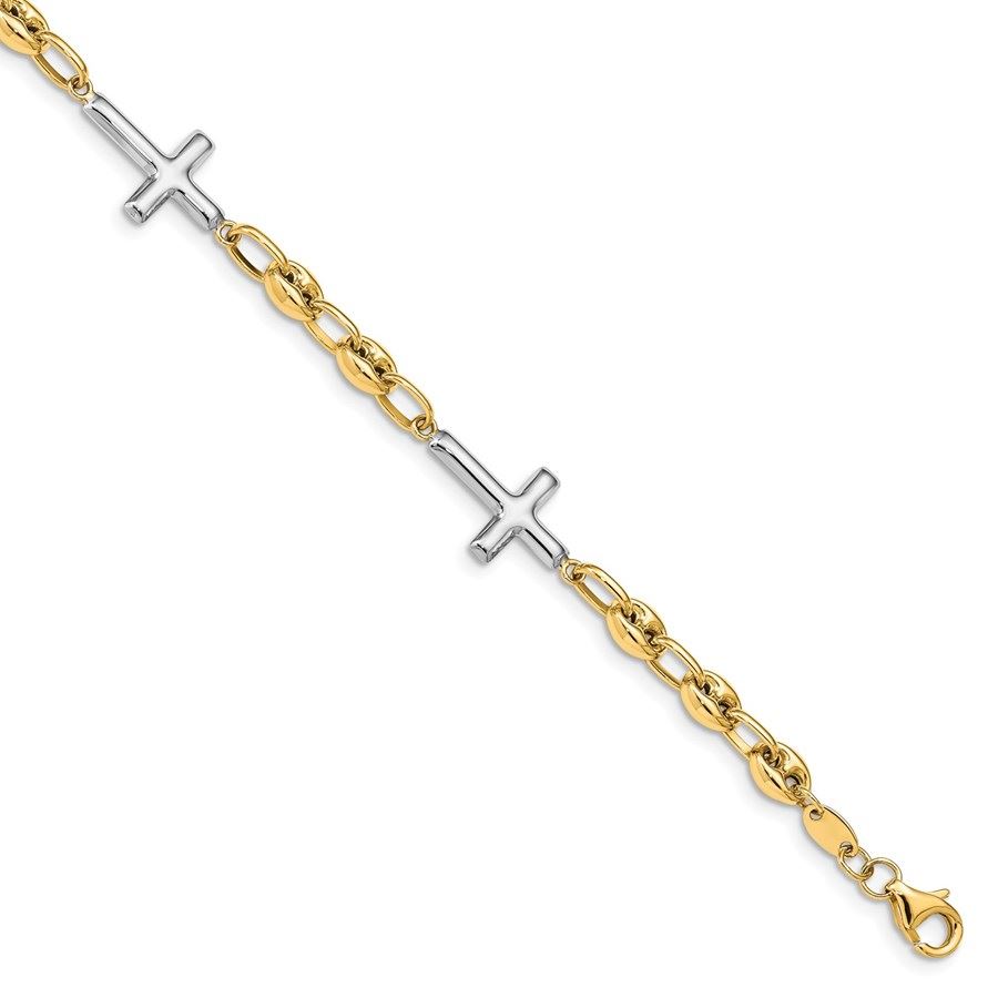 14K Two-tone Polished Sideways Cross Bracelet - 7.5 in.