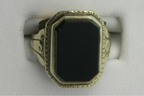 14K YELLOW GOLD VINTAGE ONYX TABLET RING. 3.6 GRAMS. (MINOR CHIP ON CORNER OF ONYX)