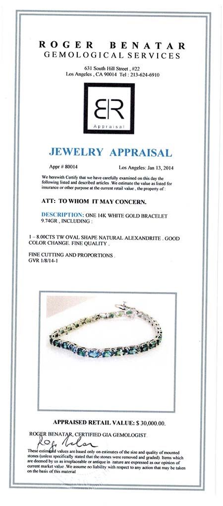 14K W/G BRACELET 9.74GRAM / ALEXANDRITE 8.00CT good color change /all match and well cut stone/ very rare
