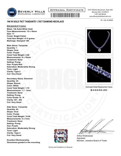 Retail: $42650.00 ****** Metal: 14k Solid White Gold / Size: 17 / Total Item Weight: 41.0 grams / Country Made: USA / / Main Stone: Tanzanite / Color: Purple / Carat Total Weight: 2.00 / Treatment: None / Clarity: Type 2 / Cut: Very Good / / Secondary Stone: Diamond / Carat Total Weight: 1.70 / Treatment: None / Color Grade: G - H / Clarity: SI1 - SI2 / Cut: Very Good / / Side Stone: Tanzanite / Color: Purple / Carat Total Weight: 74.00 / Treatment: None / Clarity: Type 2 / Cut: Very Good / ****** Ref: JQL-N-6608