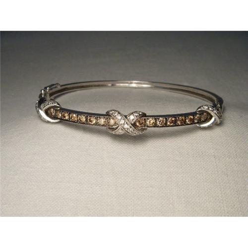 You are looking at an estate 14K white gold chocolate diamond X bangle bracelet. This beautiful piece features 16 brilliant round chocolate diamonds measuring 3 mm each and 45 brilliant round diamonds measuring 1 mm each. The total weight of the diamonds is 1.5 carats. The bracelet can fit up to a 7.5 inch wrist. It measures 1/8 of an inch wide. It weighs 11.1 grams. It is in mint condition.