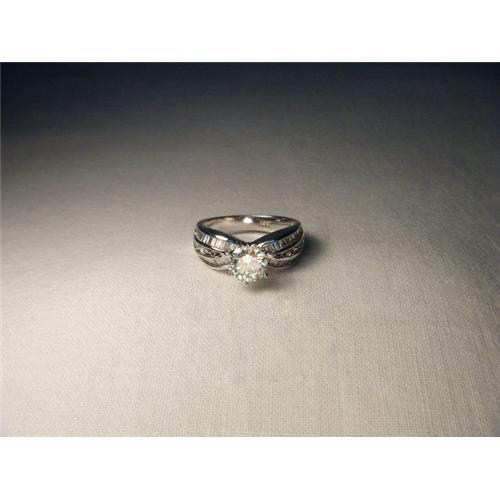 You are looking at an estate 14K white gold solitaire diamond engagement ring. This exquisite piece features a brilliant cut round diamond, weighing 1.02 carats. It is M color and I clarity. Surrounding the center stone are 48 baugette diamonds, weighing a total of 1 carat. They are G-H color and SI clarity. The top of the ring measures 1/4 of an inch at it's widest point. It is a size 7.25. Sizing is available. It weighs 5.7 grams. It is in mint condition. The certified appraisal is available at the time of purchase and will be included with the ring. The estimate value of this beautiful piece is $7,500.00.